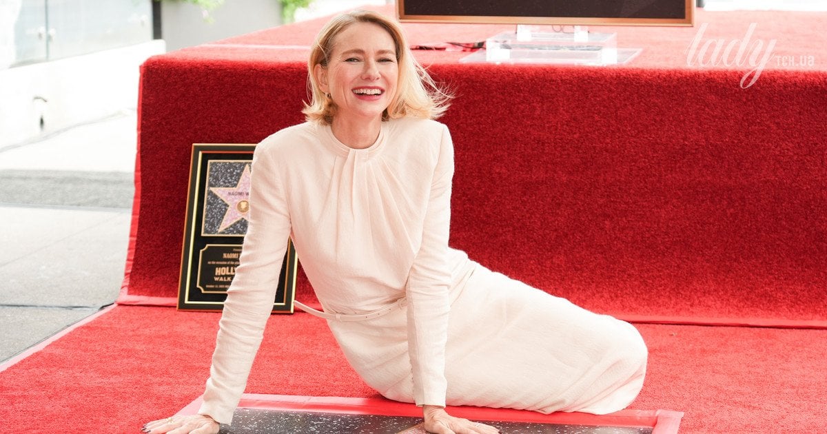 На важливому заході Наомі Воттс з’явилася в простій сукні пастельного кольору довжини міді. Вона була скромною, класичною та елегантною. Доповнила вона вбрання чорними босоніжками від Céline з ремінцями, поясом на талії, легким укладанням і макіяжем.