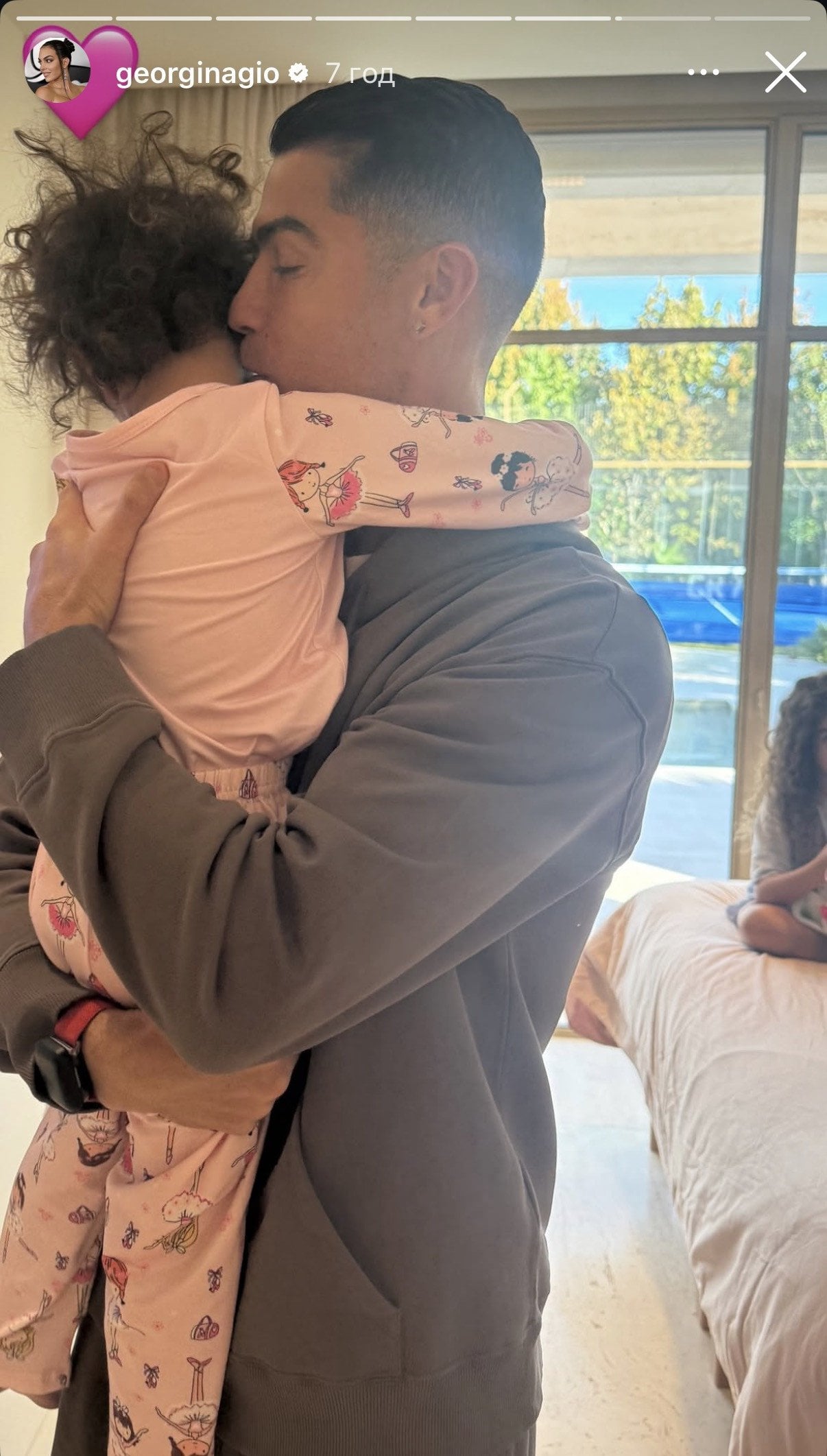 Кріштіану зазнімкований зі своєю молодшою донькою Беллою Есмеральдою, яка народилася у квітні 2022 року. Трирічна дівчинка в рожевій піжамі обіймає тата і притискається до нього, а футболіст її цілує.