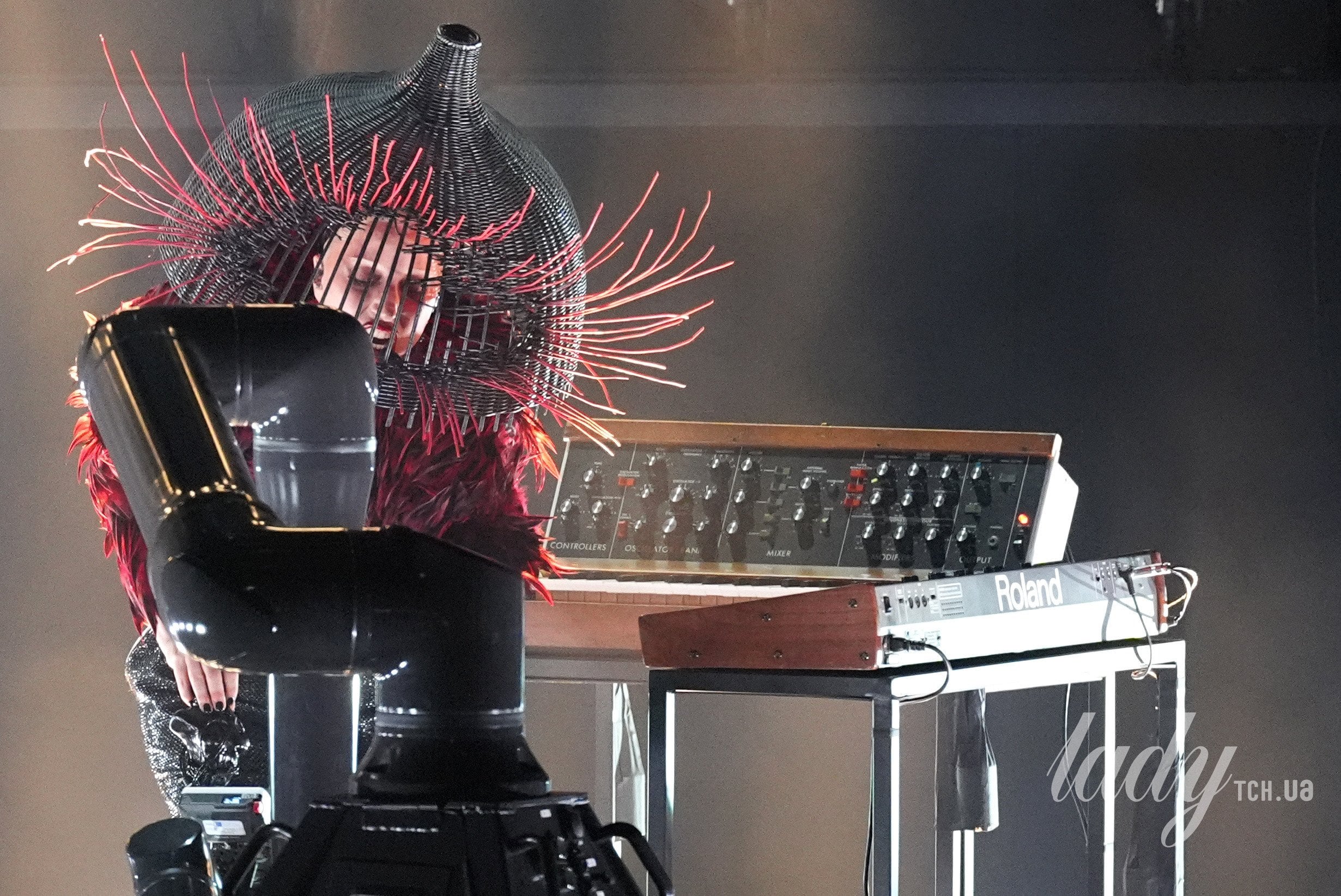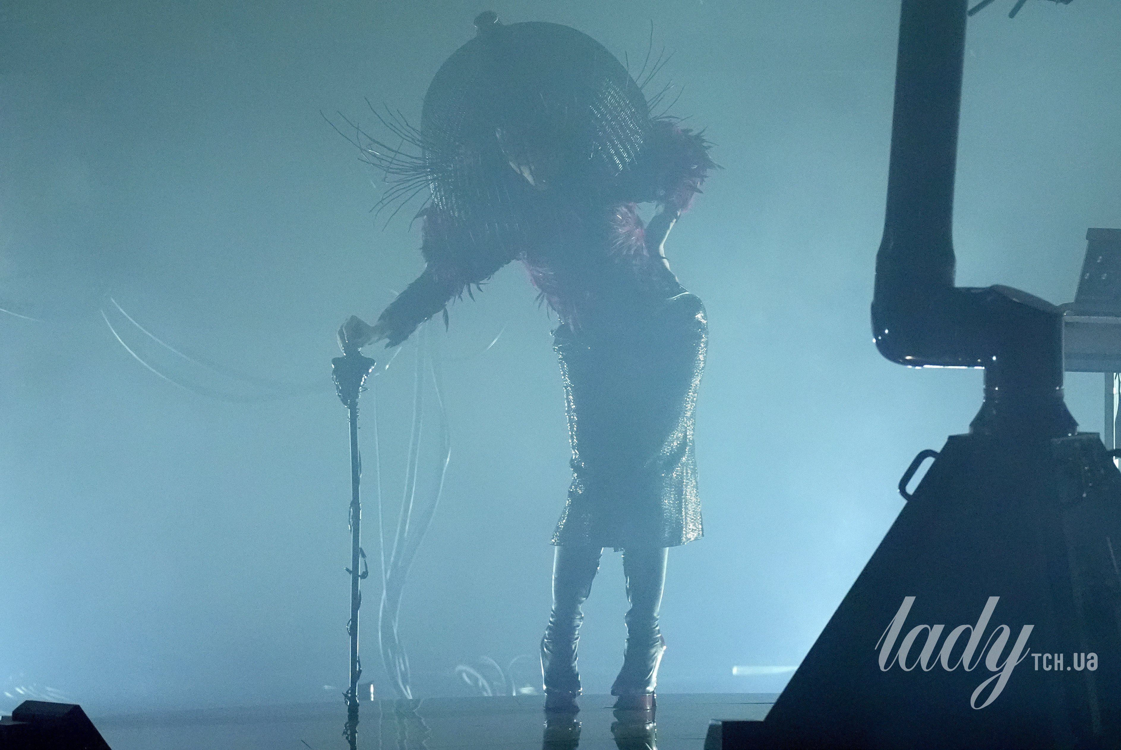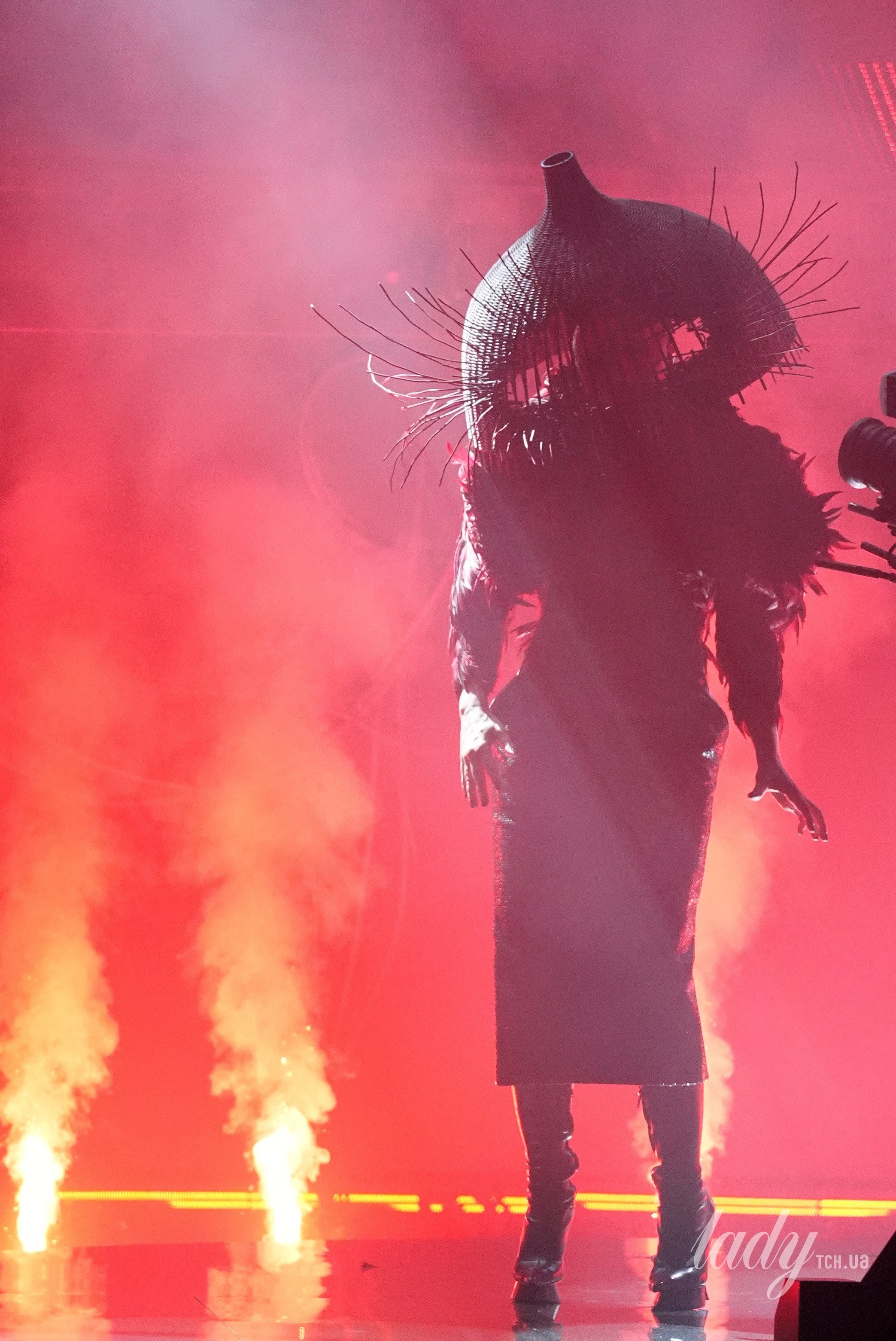 У розкішній і незвичній сукні співачка нагадувала чорного ворона. Також вбрання мало високий комір з пір’їнами, які стирчали догори, та пишний довгий шлейф із фатином.