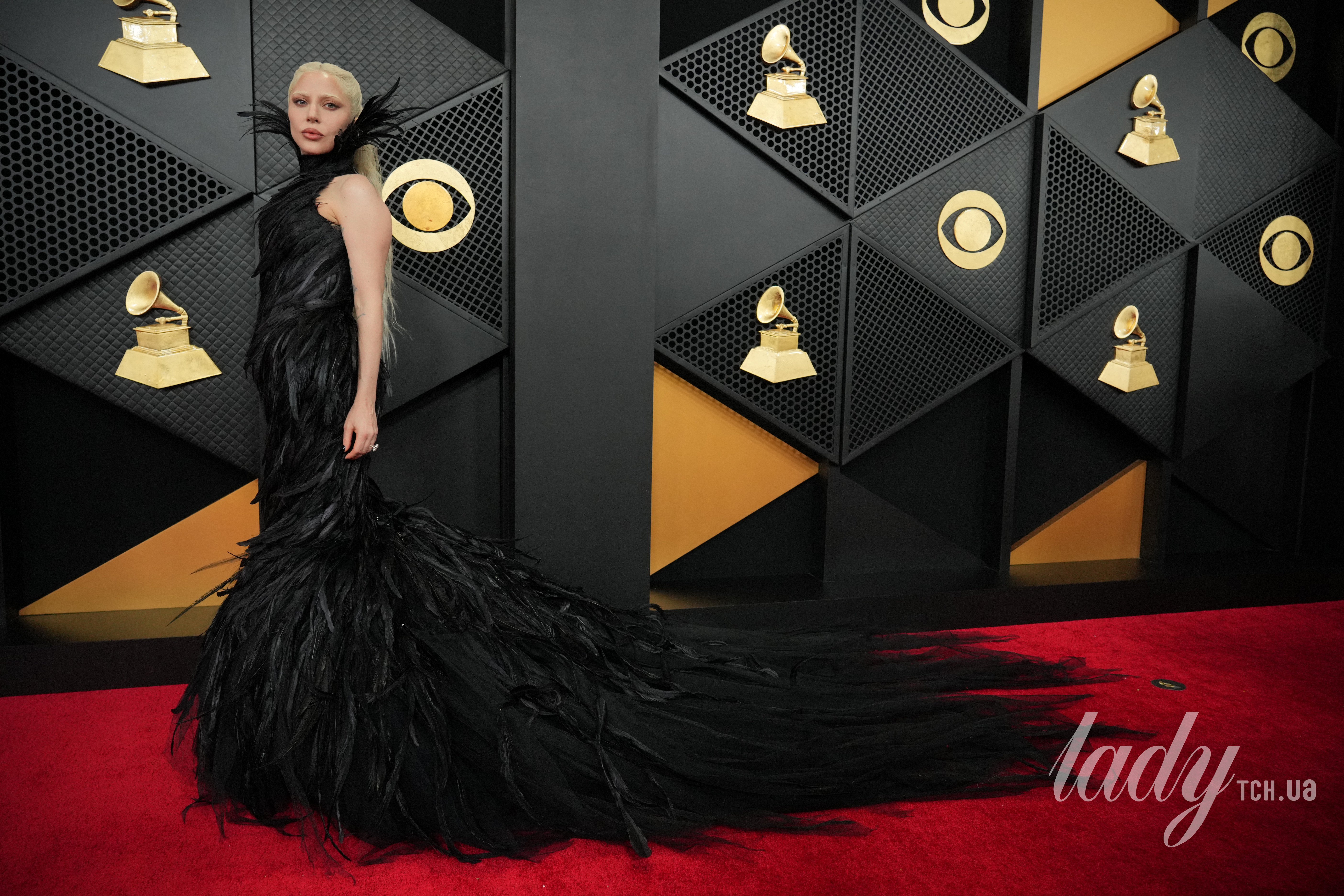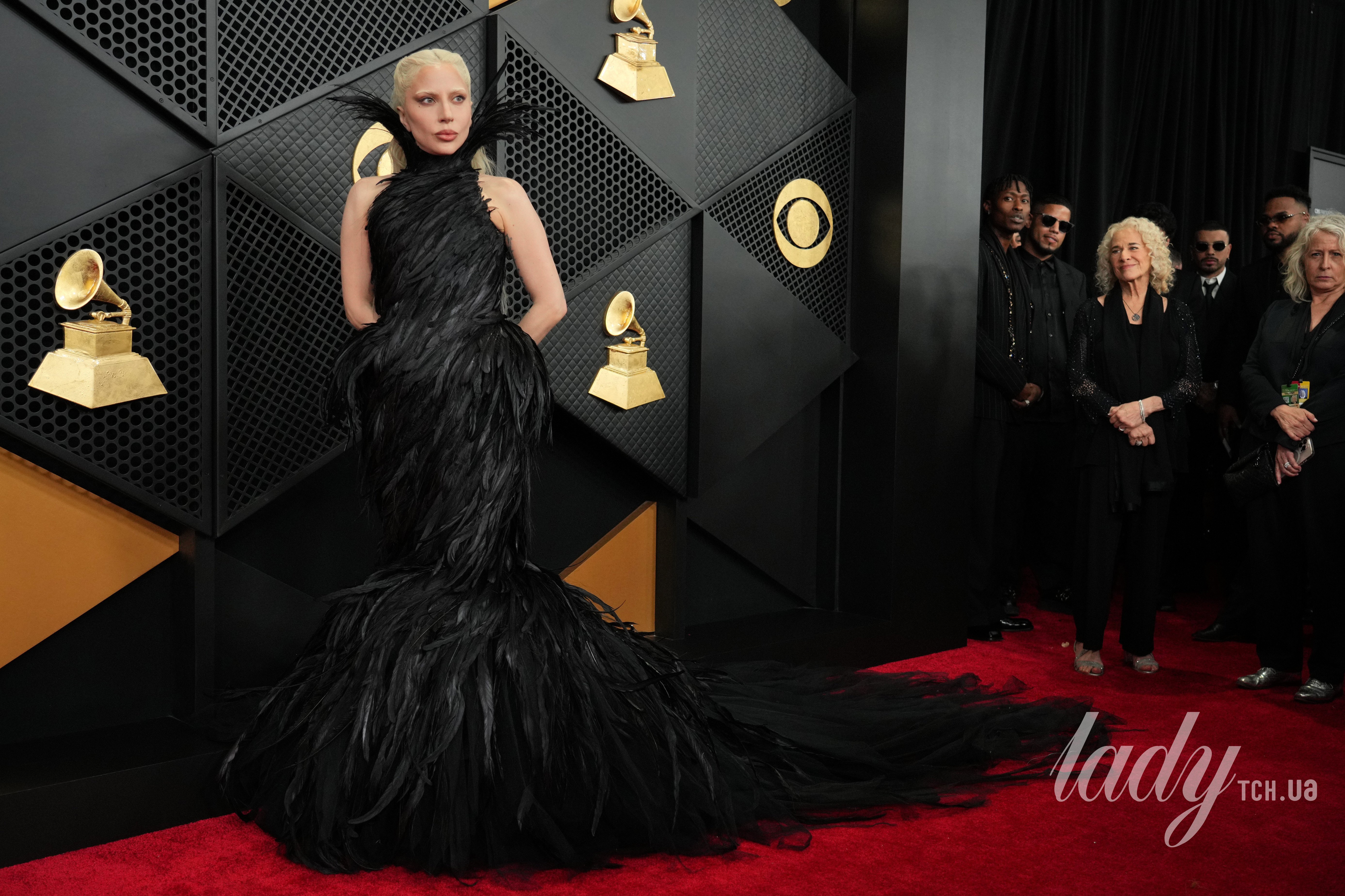 Виконавиця Леді Гага з’явилася на червоній доріжці церемонії «Греммі-2026» в образі з чорним пір’ям від Matières Fécales, який ідеально обтискав кожен вигин її фігури.