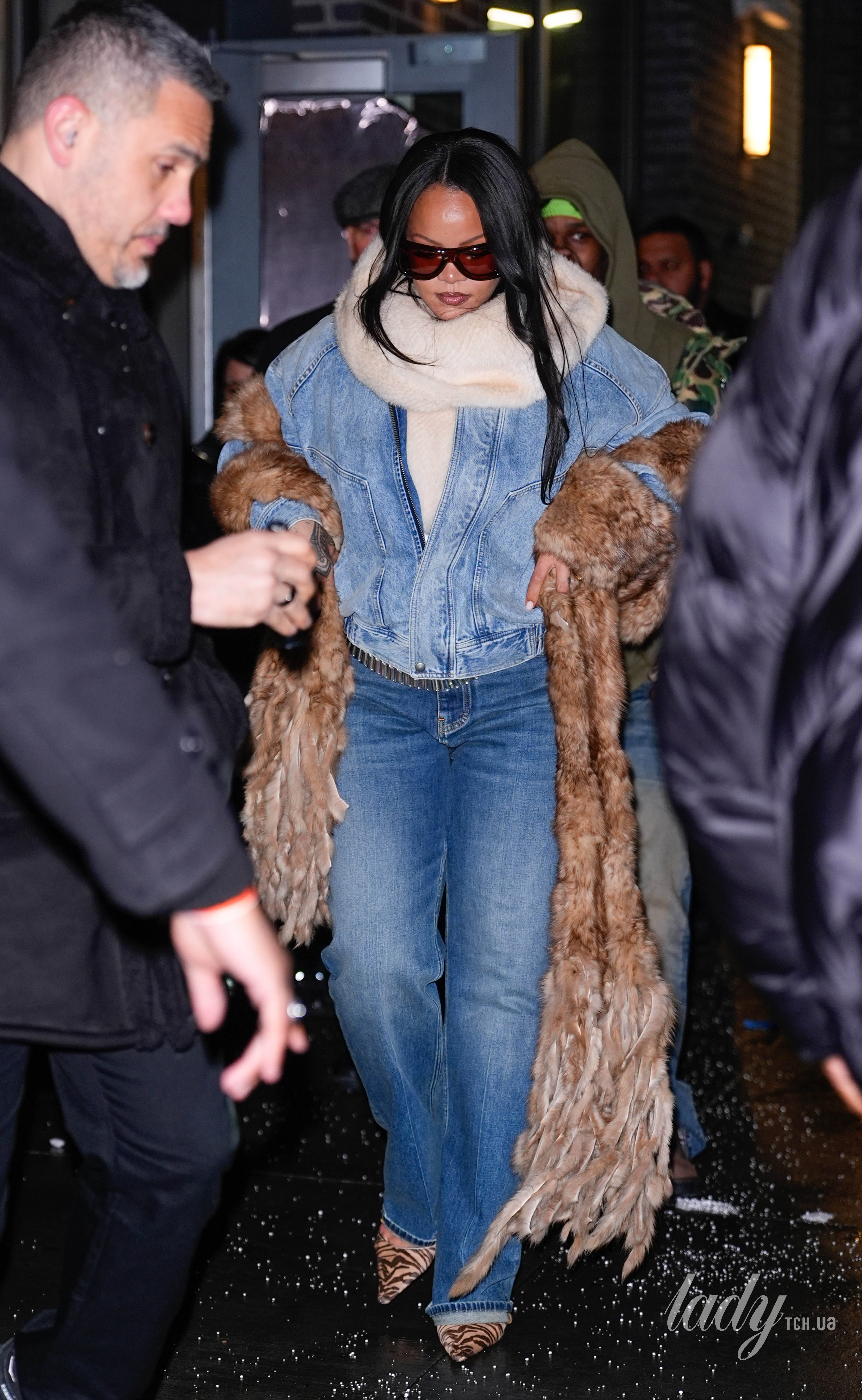 Ріанна одягла джинсову куртку-бомбер на блискавці та джинси прямого крою з трендовими відворотами. Шику образу додали туфлі в анімалістичний принт, теплий светр та окуляри.