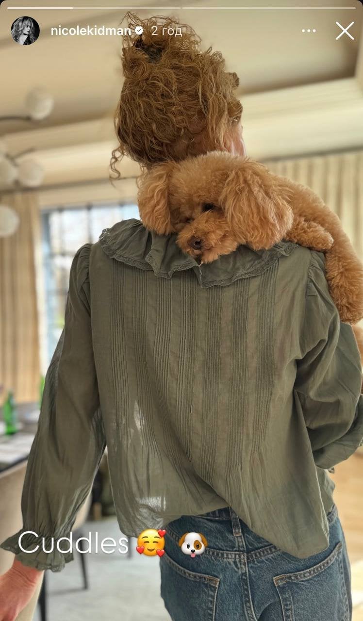 На фото акторка зображена зі спини в невимушеному повсякденному образі: на ній блузка кольору хакі та класичні джинси. Ніколь ніжно притискає до плеча невеликого собаку, імовірно породи той-пудель. «Обіймашки», — підписала знімок зірка.