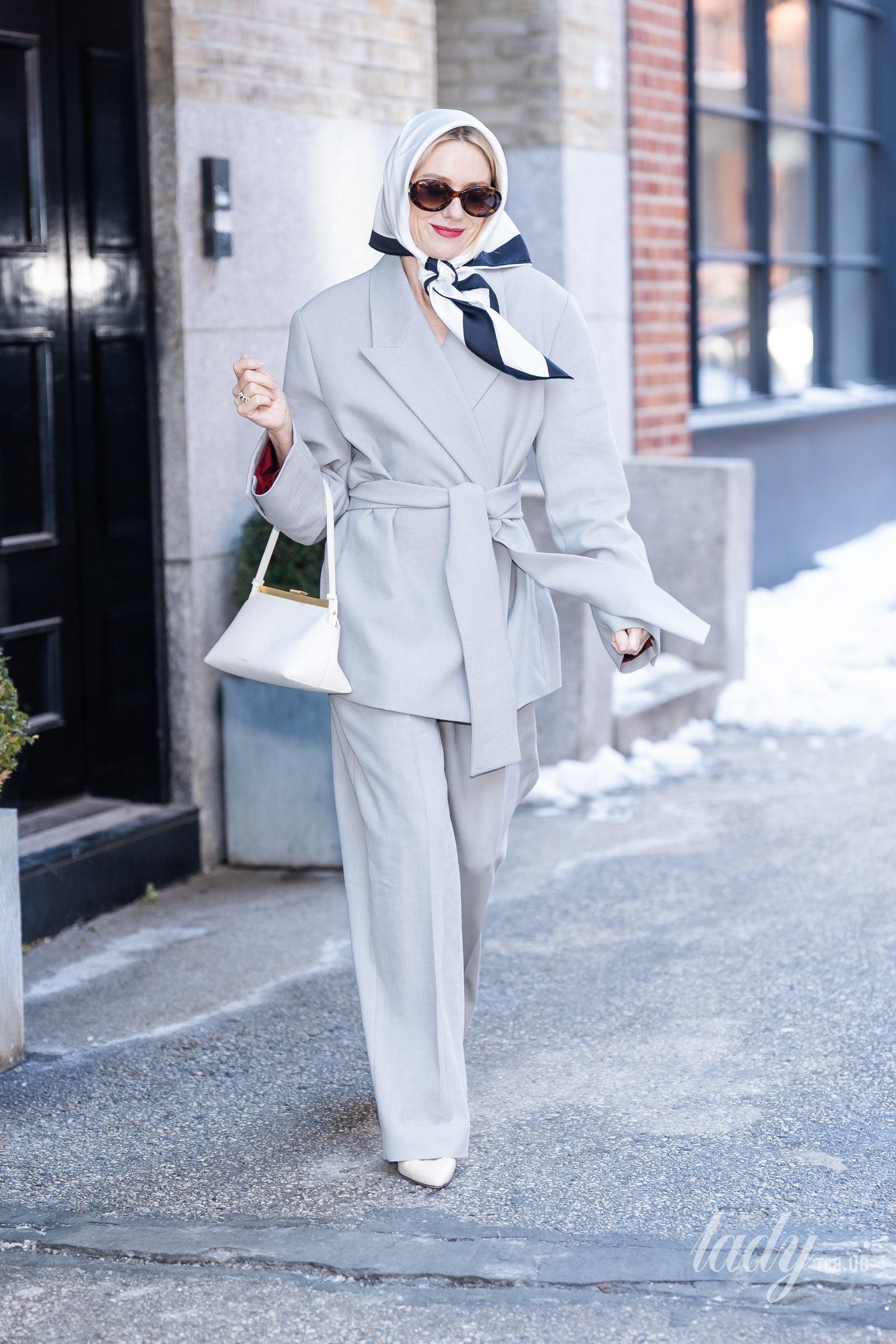 Зараз акторка проводить час у Нью-Йорку в межах промо-туру до серіалу. Папараці сфотографували її в елегантному сірому костюмі зі штанами та жакетом на запах від бренду Gia Studios, який вона одягла в поєднанні з білими туфлями та сумкою в ретростилі від бренду Kassandre.