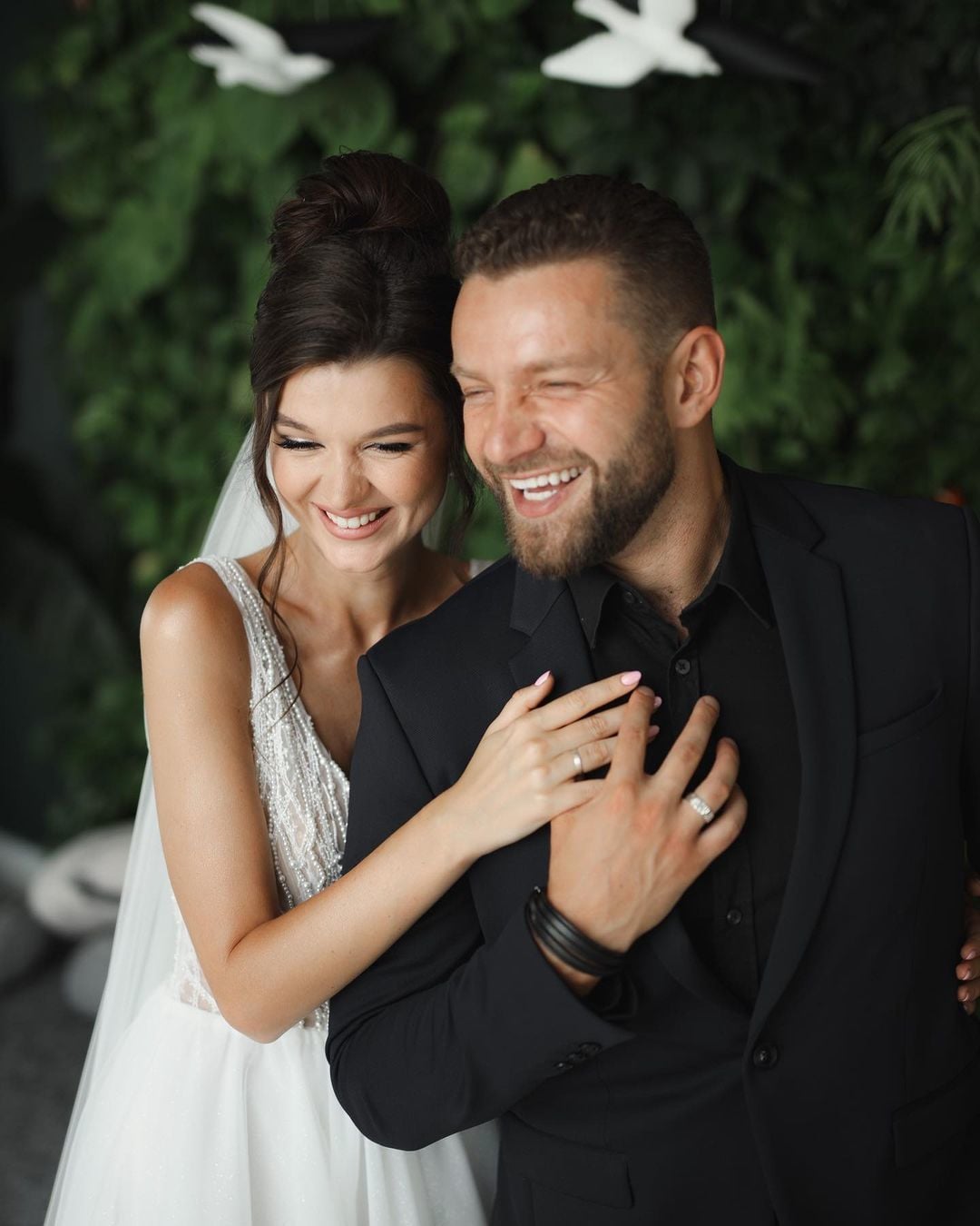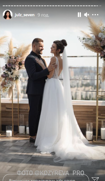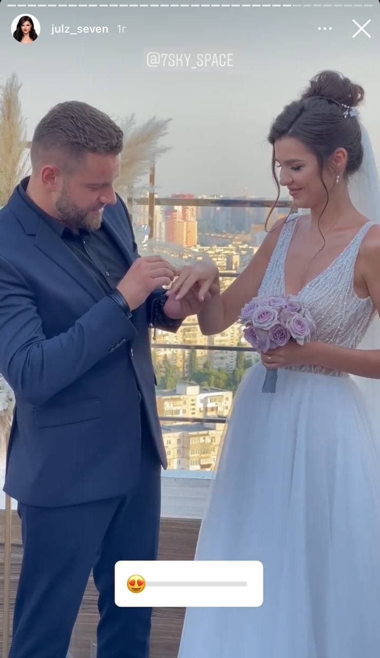 Сьогодні ж "Зайка" опублікувала в Instagram Stories нові світлини з весілля. До речі, для такої події Юля обрала довгу сукню, розшиту на корсеті бісером, з V-подібним вирізом та оголеною спиною. Волосся їй зібрали у пучок, випустивши спереду пасма, і прикрасили довгою фатою. У руках вона тримала ніжний букет з лавандовим відтінком.