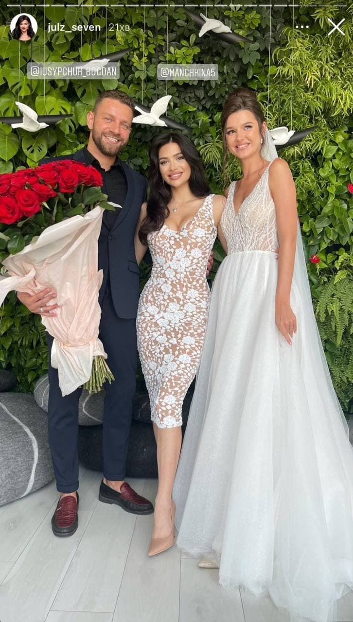 На весіллі також побувала фіналістка 10-го сезону "Холостяка" – Дана Оханська. Вона одягла темно-синю оксамитову коротку сукну з оголеними плечима та розрізом.