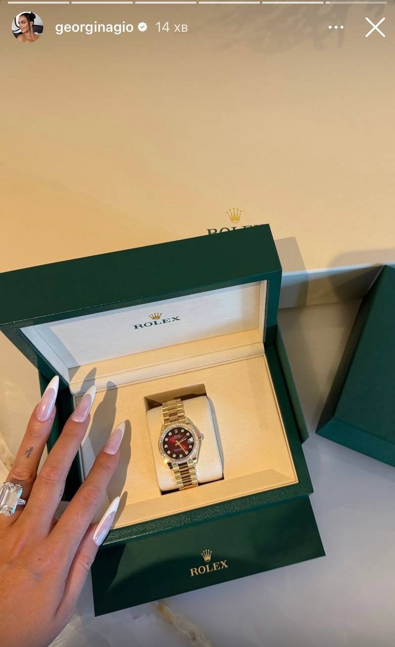 Кріштіану знає про любов своєї нареченої до дорогих аксесуарів класу люкс. Вона вже зібрала цілу колекцію розкішних сумок Hermes, а також неймовірну колекцію годинників загальною вартістю щонайменше 2,5 млн доларів. Тож він не став довго думати над подарунком і презентував їй Rolex із діамантами.