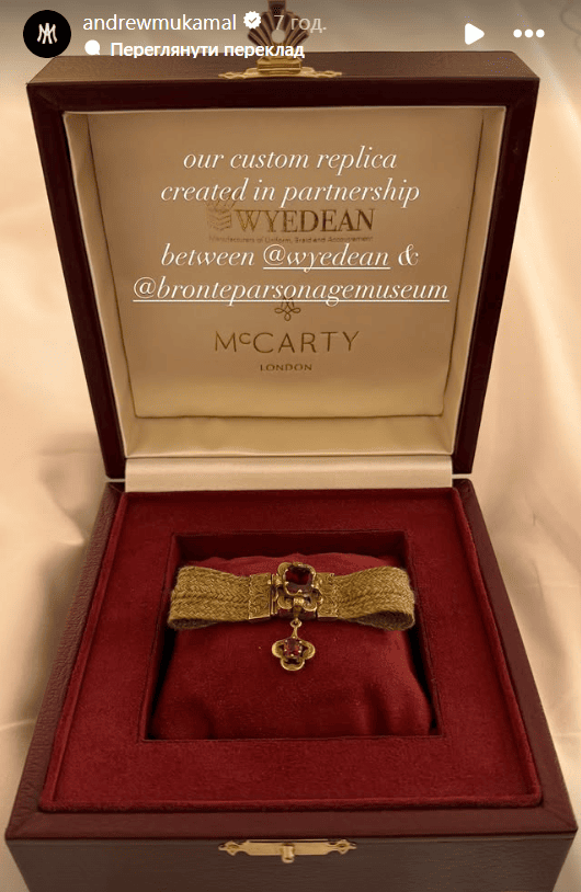Браслет був виготовлений зі справжнього волосся померлих сестер письменниці — авторка Буремного перевалу» Емілі Бронте та її сестра Анна пішли з життя з різницею в п’ять місяців, у грудні 1848 року та травні 1849 року відповідно. Після їхньої смертіі сестер Шарлотта Бронте замовила оригінальний браслет, зроблений з їхнього волосся, сплетеного разом. Кажуть, що Шарлотта носила цей особливий браслет щодня, а від 1923 року він належить Brontë Parsonage Museum.