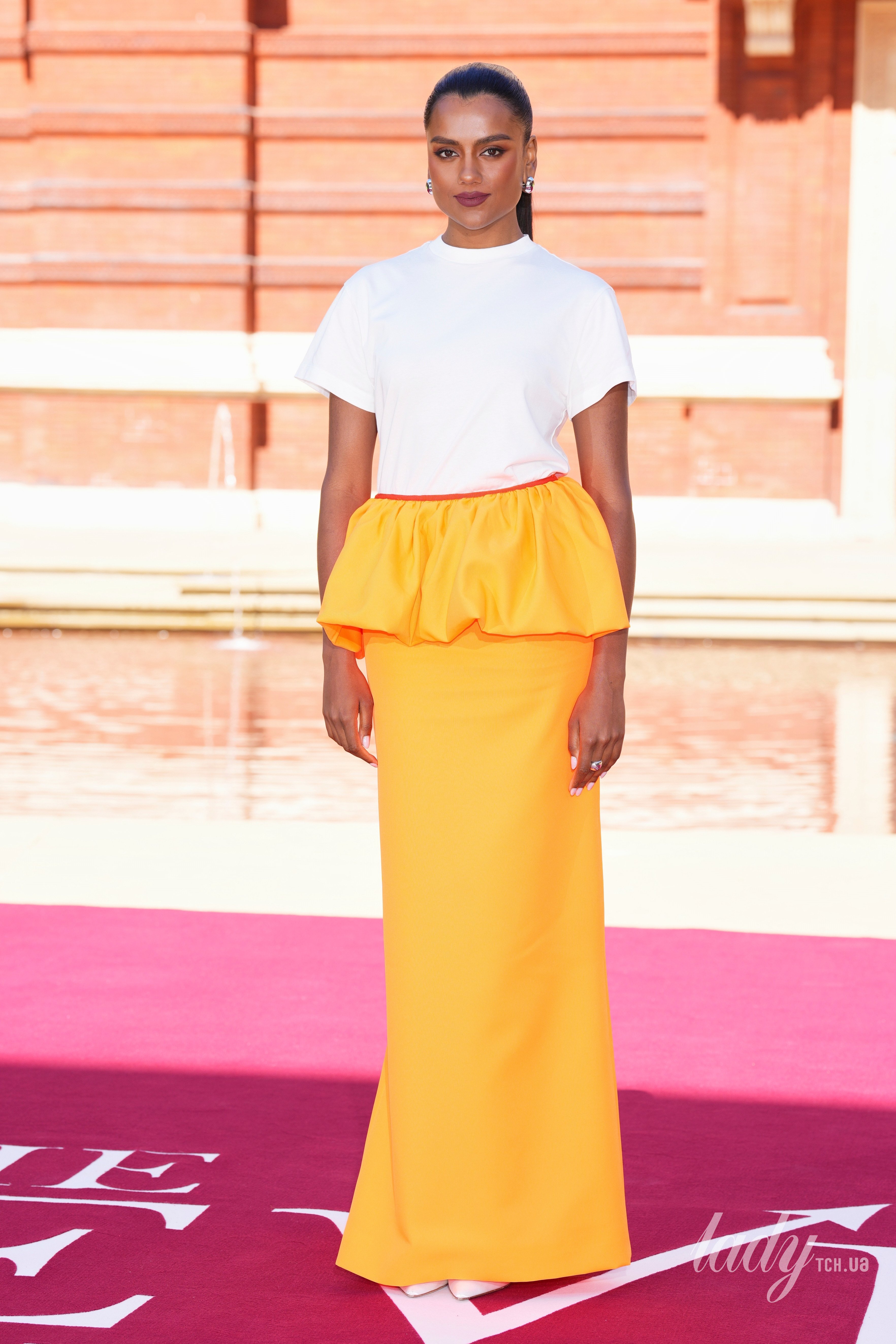Сімон обрала сукню від Jil Sander з білим верхом та помаранчевим низом, яку прикрашала баска. Волосся вона зібрала у хвіст, тому змогла продемонструвати срібні сережки.