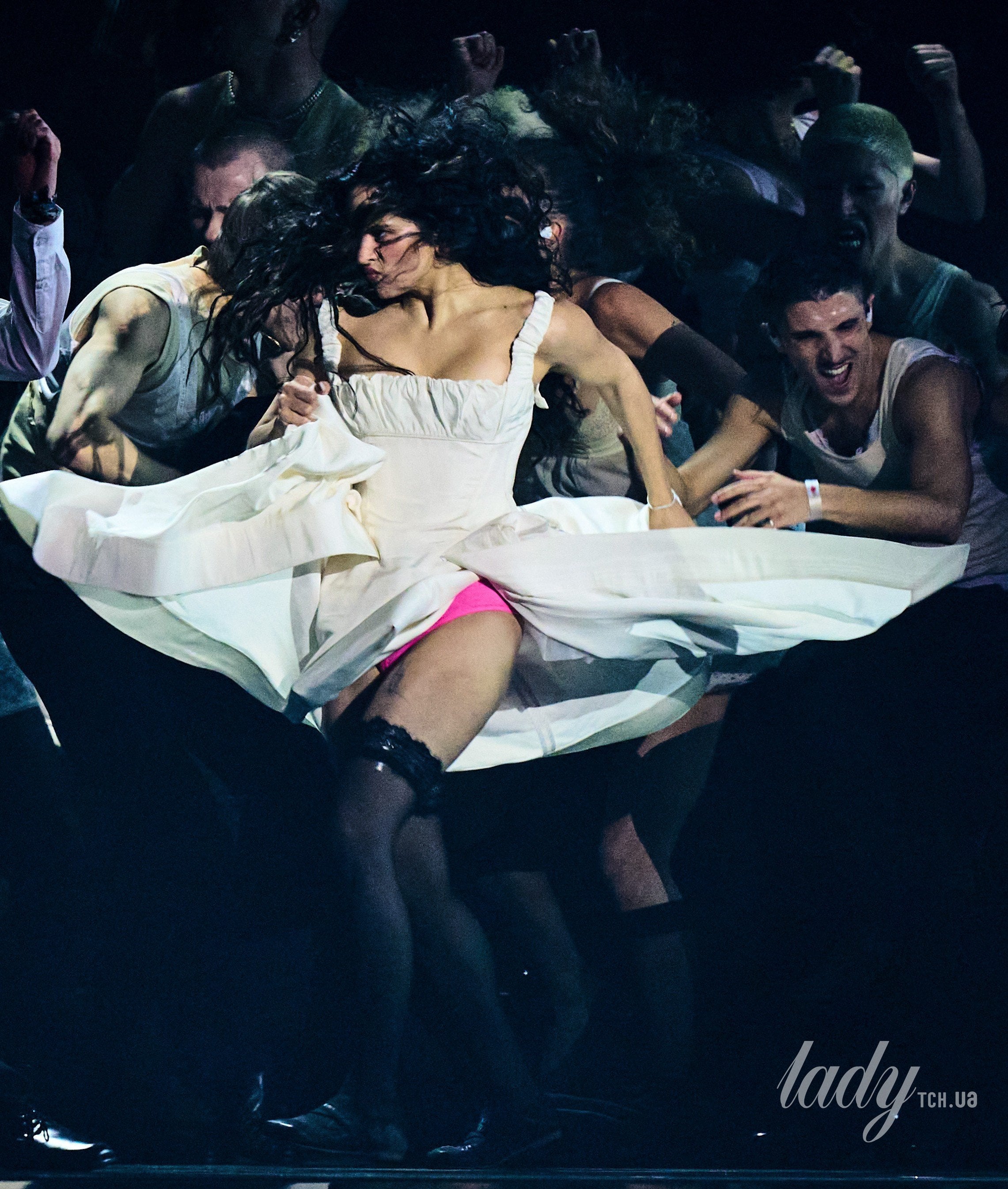 Одягла сукню співачка з чорними панчохами та рожевими трусами.
