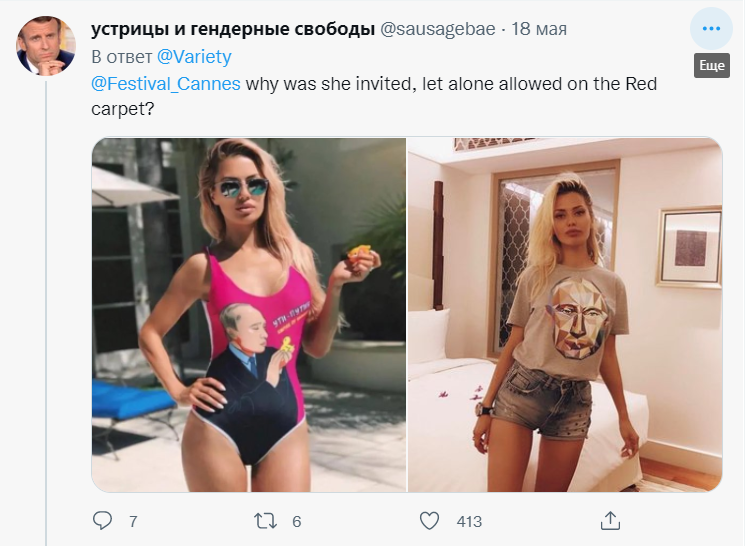 "Сьогодні у мене попросили піти з червоної доріжки Канського кінофестивалю... Тому що я законослухняна громадянка, то я пішла! Мені не хотілося прориватися туди крадькома, ховаючи свій клатч, я йшла з гордо піднятою головою! Мені сказали, що якщо я вийду так до преси, то буде надто багато публікацій у пресі. Це все, чим мені аргументували відмову вийти до фотографів. Але я залишу це тут, тому що моє повідомлення сьогодні було від усіх жінок! Жінка відповідальна лише за мир у цьому світі!" — написала росіянка.
