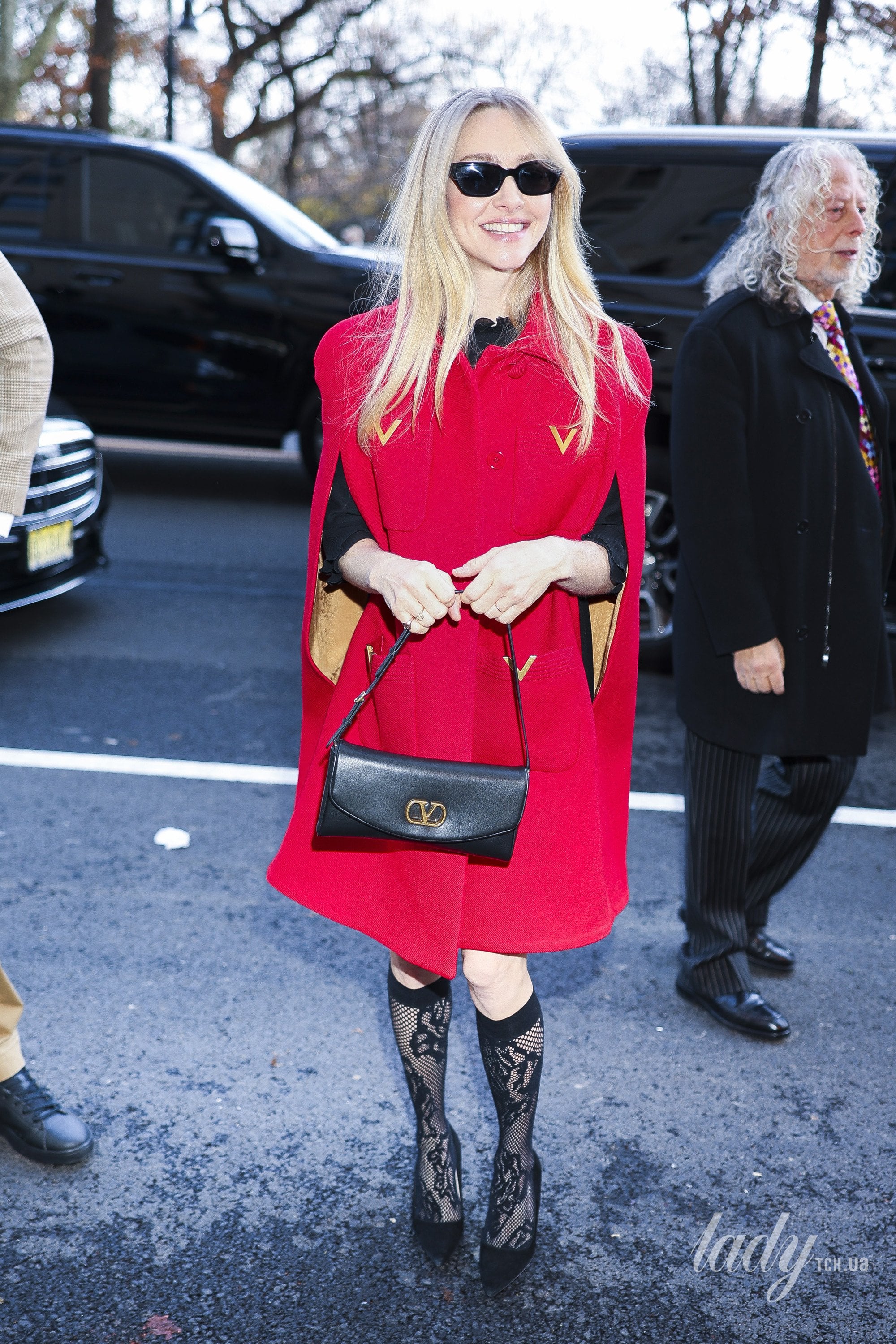 Перший образ, який Аманда продемонструвала у Нью-Йорку включав речі від бренду Valentino, зокрема яскравий червоний кейп і чорну мінісукню. Також акторка доповнила цей образ туфлями від Jimmy Choo, сумкою Valentino чорного кольору, сонцезахисними окулярами і дуже незвичним аксесуаром — чорними мереживними гольфами.