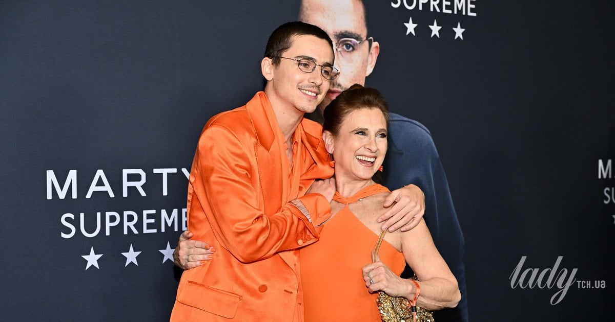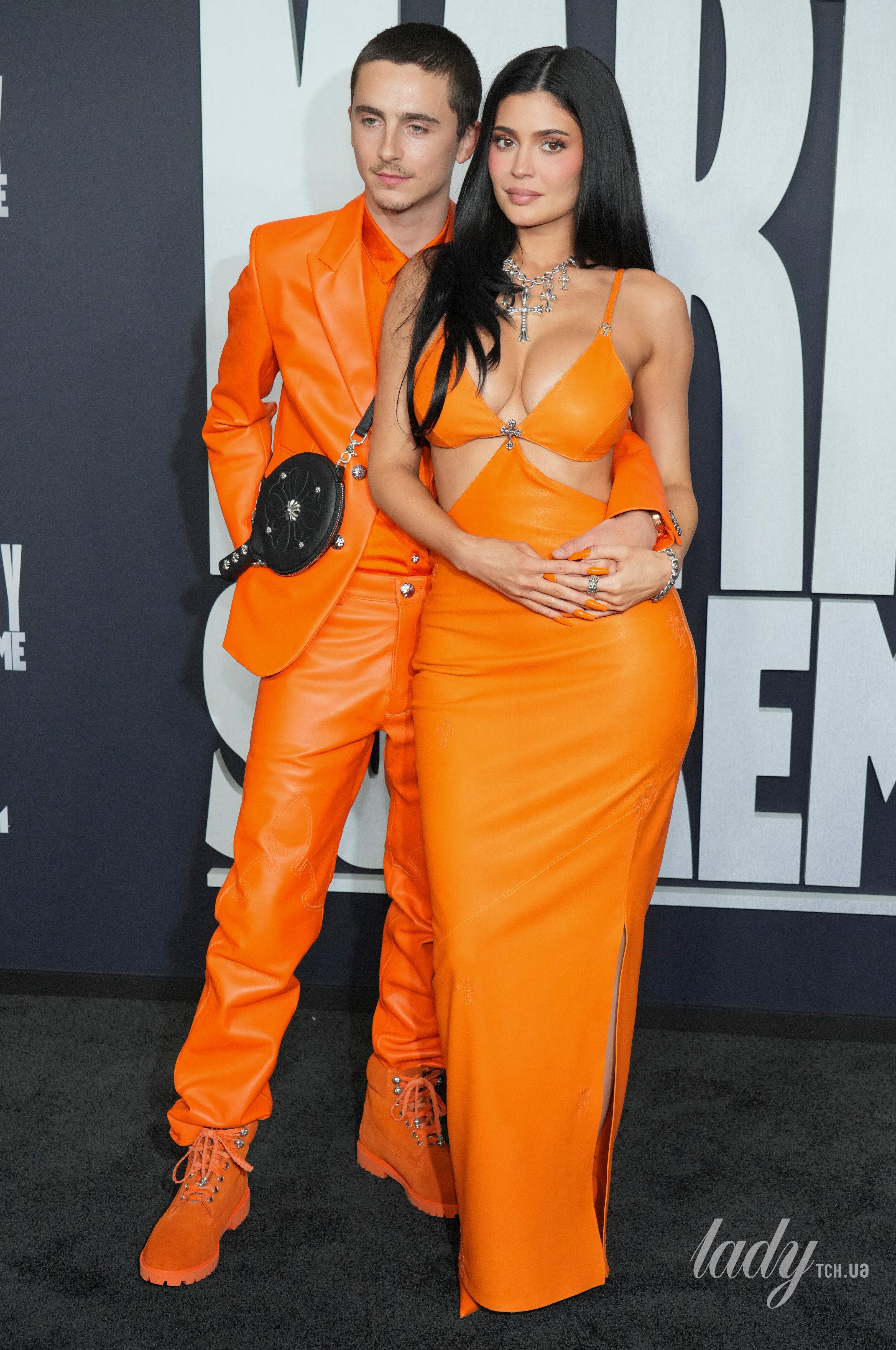Однак цього разу Тімоті вийшов на публіку не зі своєю дівчиною Кайлі Дженнер, а з мамою Ніколь Флендер. Жінка також одягла помаранчеву сукню у якої була бретелька-галтер і відкриті плечі. Образ мама актора доповнила босоніжками на широких підборах та гламурною сумкою із золотими лелітками.