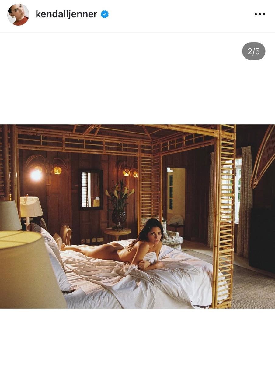 На одному з фото повністю оголена модель лежить на ліжку. Оголені груди вона прикрила ковдрою. «Неділя», — лаконічно підписала фото Дженнер.