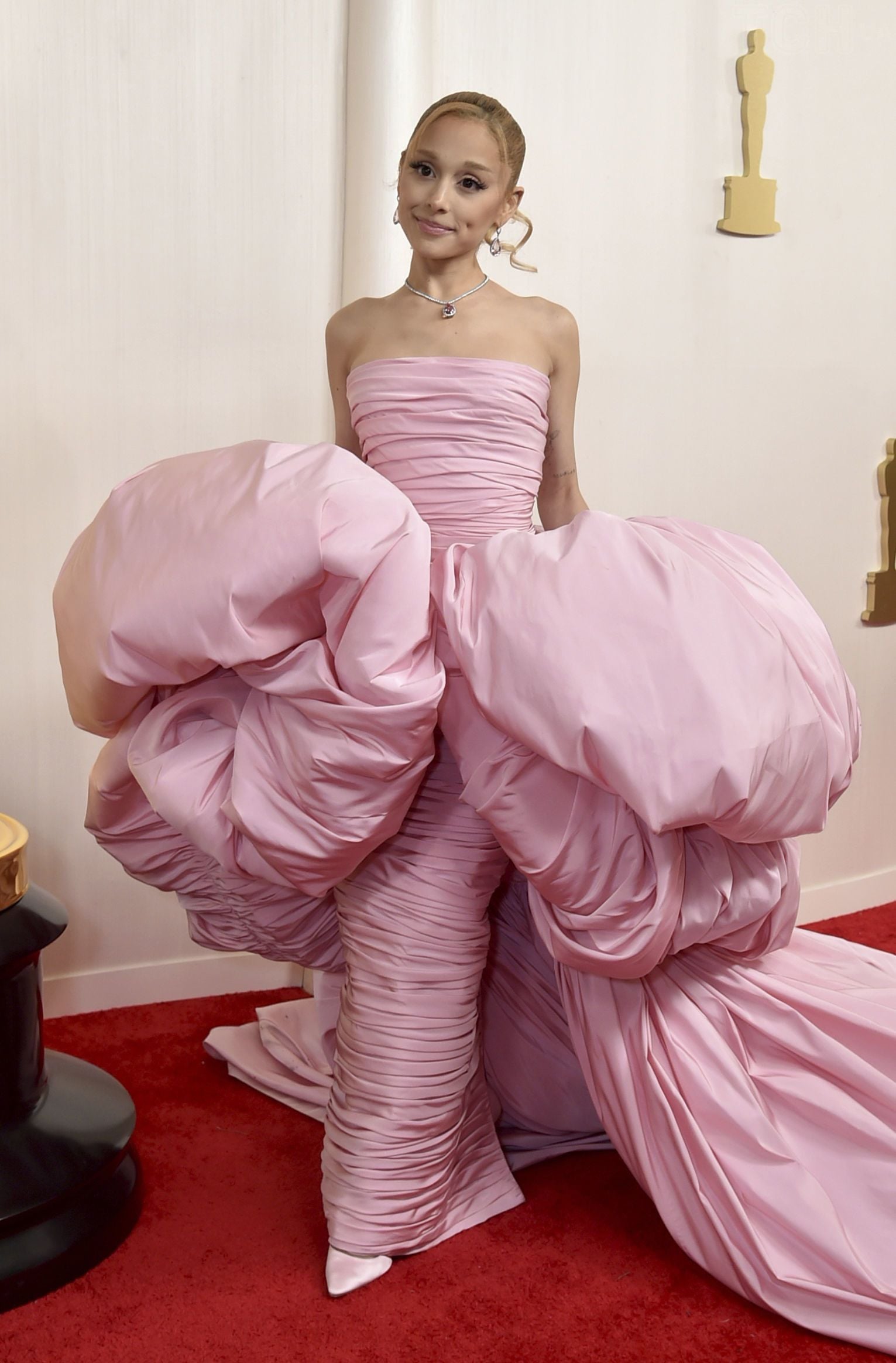 Акторка та співачка Аріана Гранде була чарівною у ніжній сукні із фатину пастельного сіро-рожевого відтінку. Створив для дівчини сукню на замовлення бренд Paolo Sebastian.
