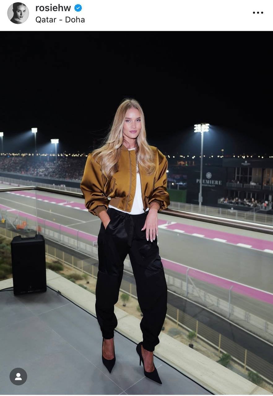 38-річна британська супермодель і екс"ангел» Victoria’s Secret Розі Гантінгтон-Вайтлі прилетіла до Катару, щоб відвідати видовищні перегони — етап чемпіонату світу «Формули-1», Гран-прі Катару. Як усе відбулося, вона показала у своєму Instagram.