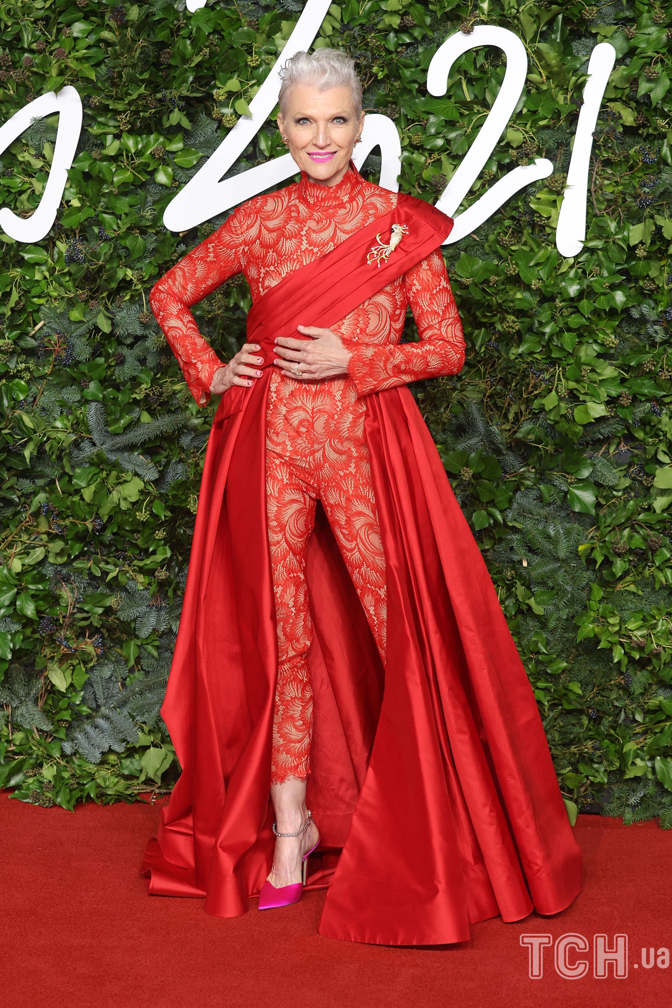 На червоній доріжці було багато знаменитостей. Серед них була 73-річна Мей Маск. Вона обрала для свого виходу червоне вбрання від лівано-італійського дизайнера Tony Ward. Воно складалося з флористичного комбінезону, довгої спідниці та широкої стрічки з драпуванням.