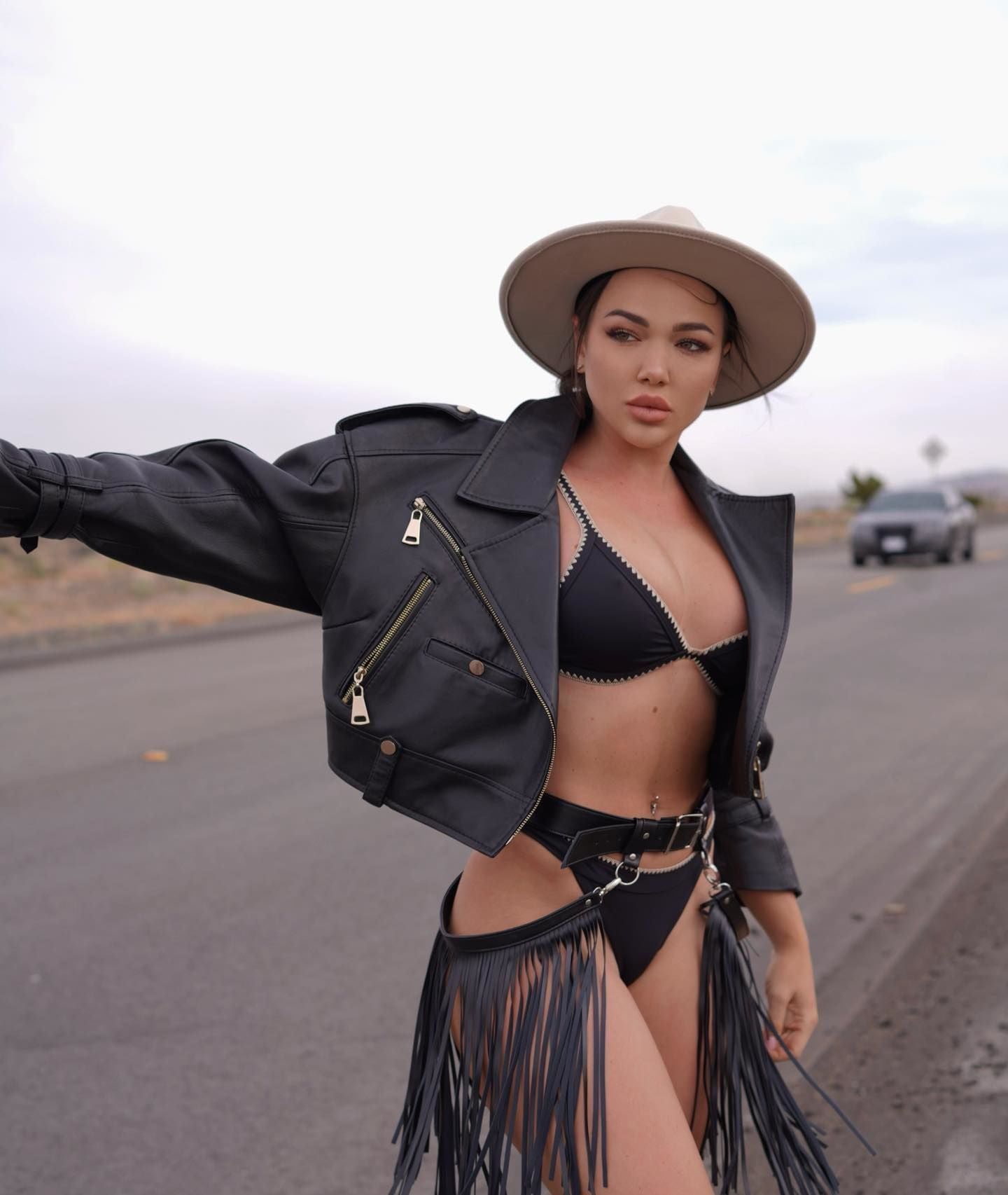 Дівчина постала перед фотокамерою у чорному бікіні з білою облямівкою. Зверху вона одягла чорну косуху і доповнила лук чорним шкіряним поясом із торочкою, яка спадала на стегна.