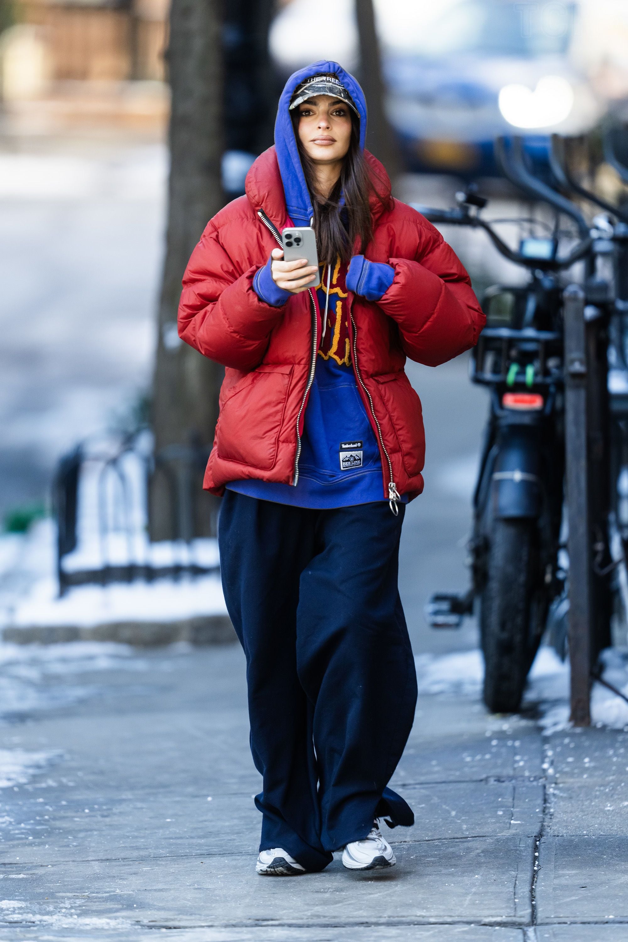 Емілі Ратаковскі одягла червону пухову куртку та синю толстовку у поєднанні з широкими синіми штанами для прогулянки Нью-Йорком.