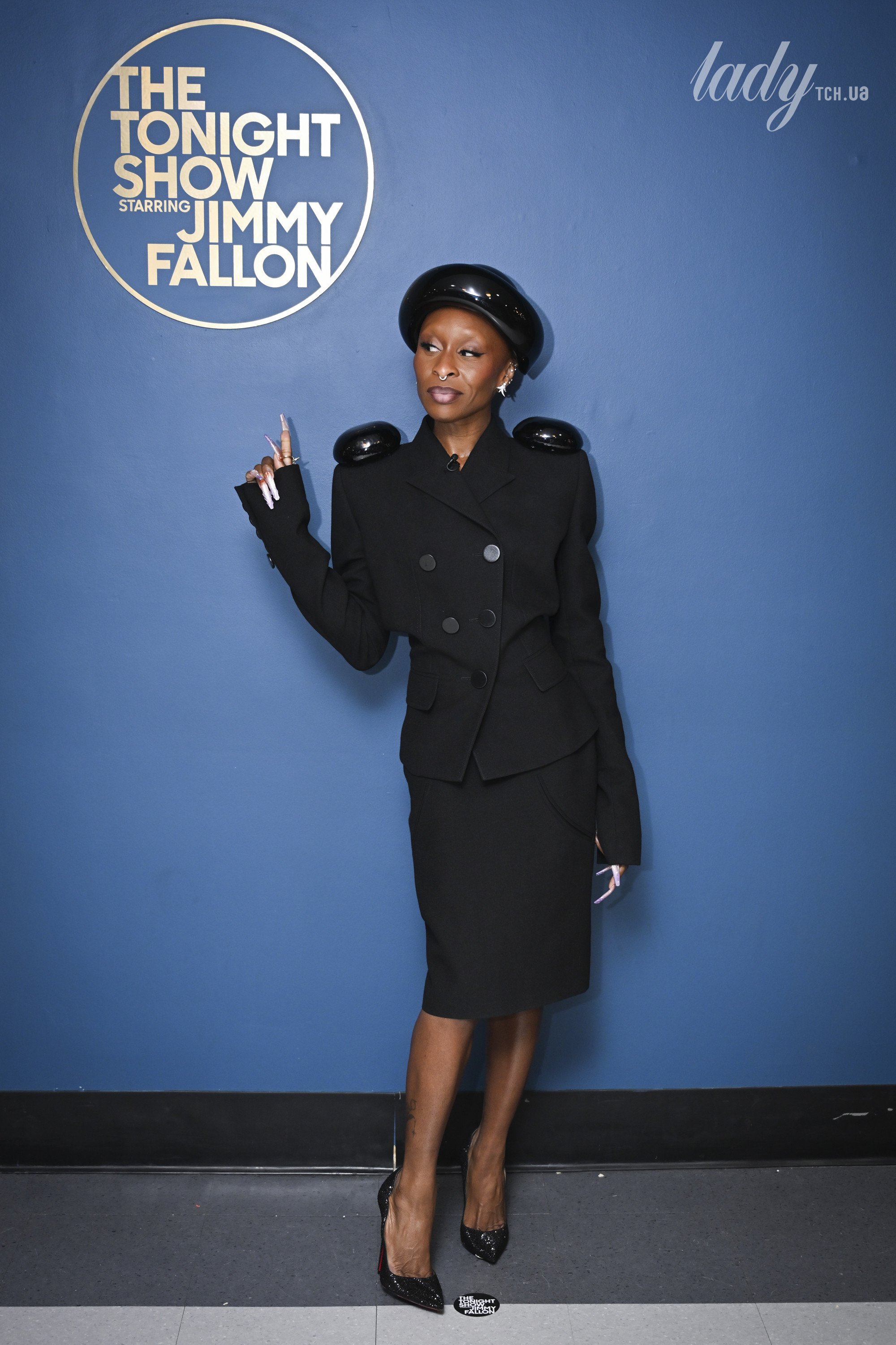 У студії зірка з’явилася в ефектному чорному вбранні з колекції Schiaparelli Spring 2026, створеній креативним директором Модного дому — Даніелем Роузберрі. На ній був костюм, який складався зі спідниці-олівця та елегантного жакета з великими чорними ґудзиками і накладними клапанами для кишень.