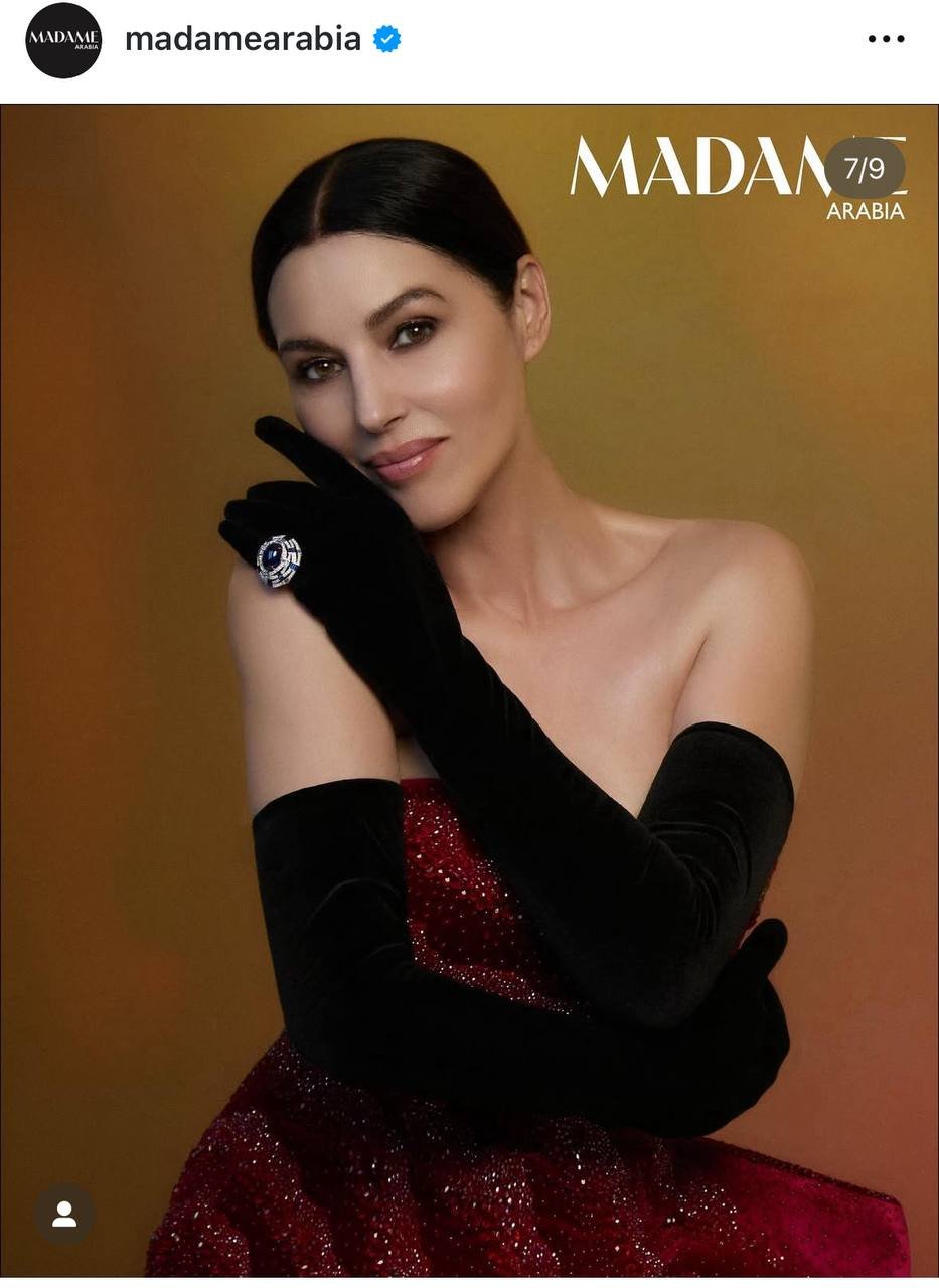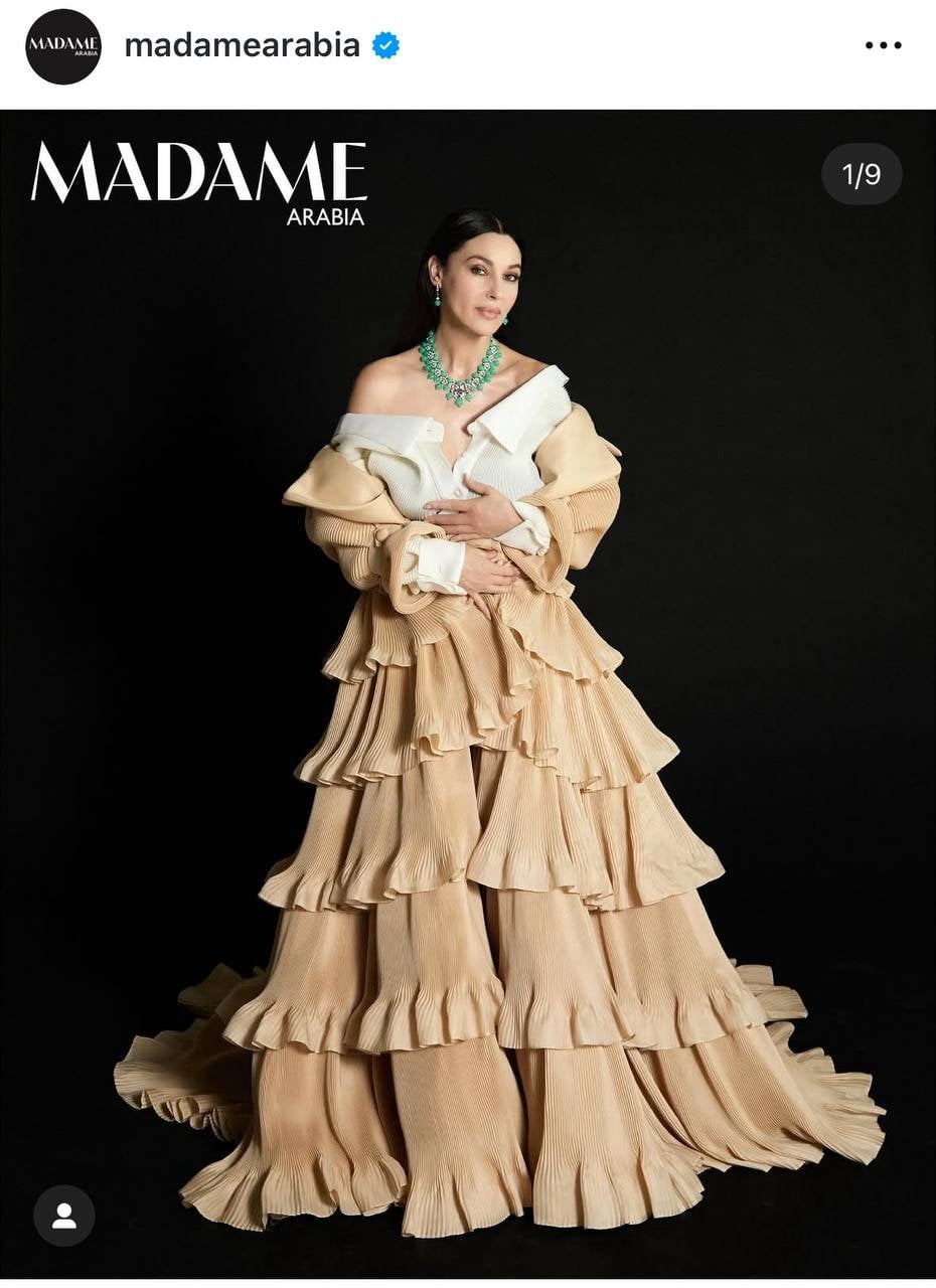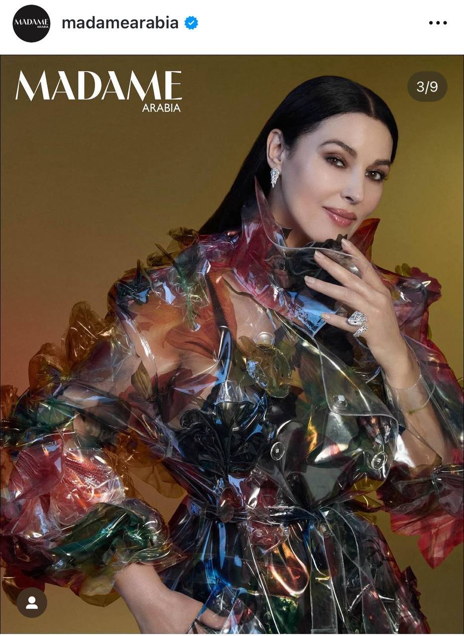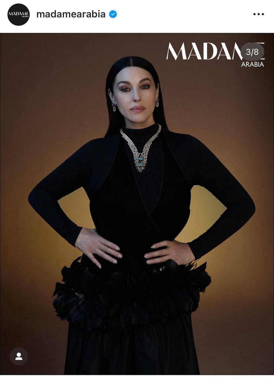 60-річна італійська акторка і модель — Моніка Беллуччі — стала головною зіркою нового випуску журналу Madame Arabia. На обкладинці глянцю вона з’явилася в чорній сукні-бюст’є і з пишним подолом від Coperni, яку доповнювали знімні пишні рукава та високі рукавички. Розкішний образ зірки завершили кольє і сережки з нефритами і діамантами від Cartier.