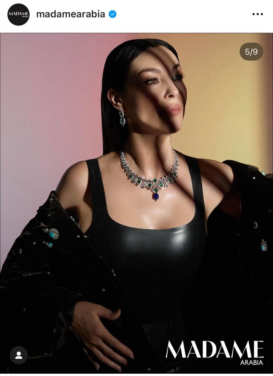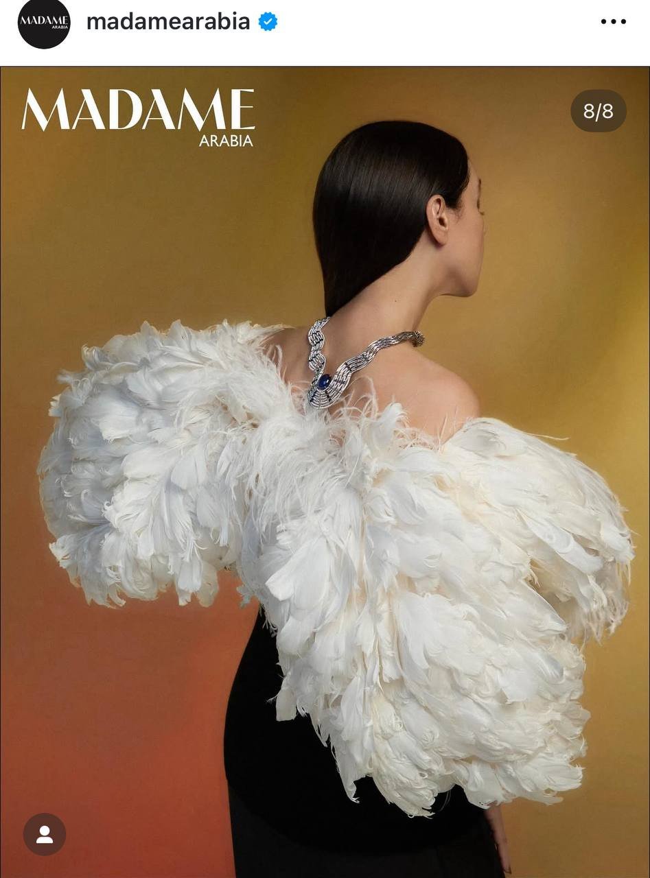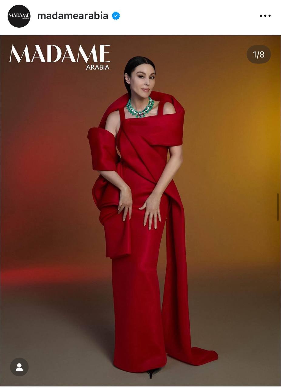 60-річна італійська акторка і модель — Моніка Беллуччі — стала головною зіркою нового випуску журналу Madame Arabia. На обкладинці глянцю вона з’явилася в чорній сукні-бюст’є і з пишним подолом від Coperni, яку доповнювали знімні пишні рукава та високі рукавички. Розкішний образ зірки завершили кольє і сережки з нефритами і діамантами від Cartier.