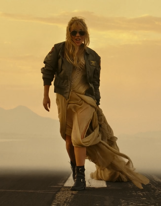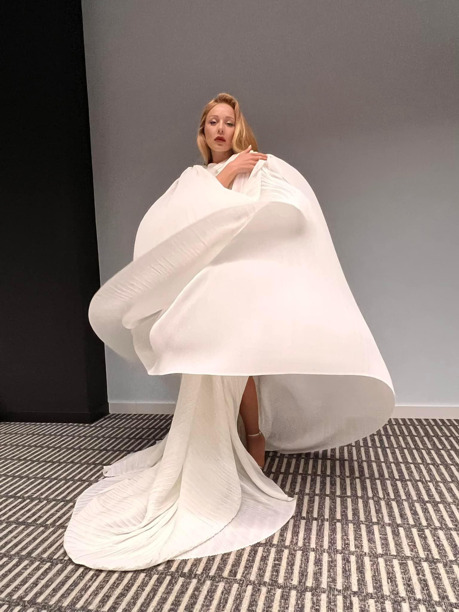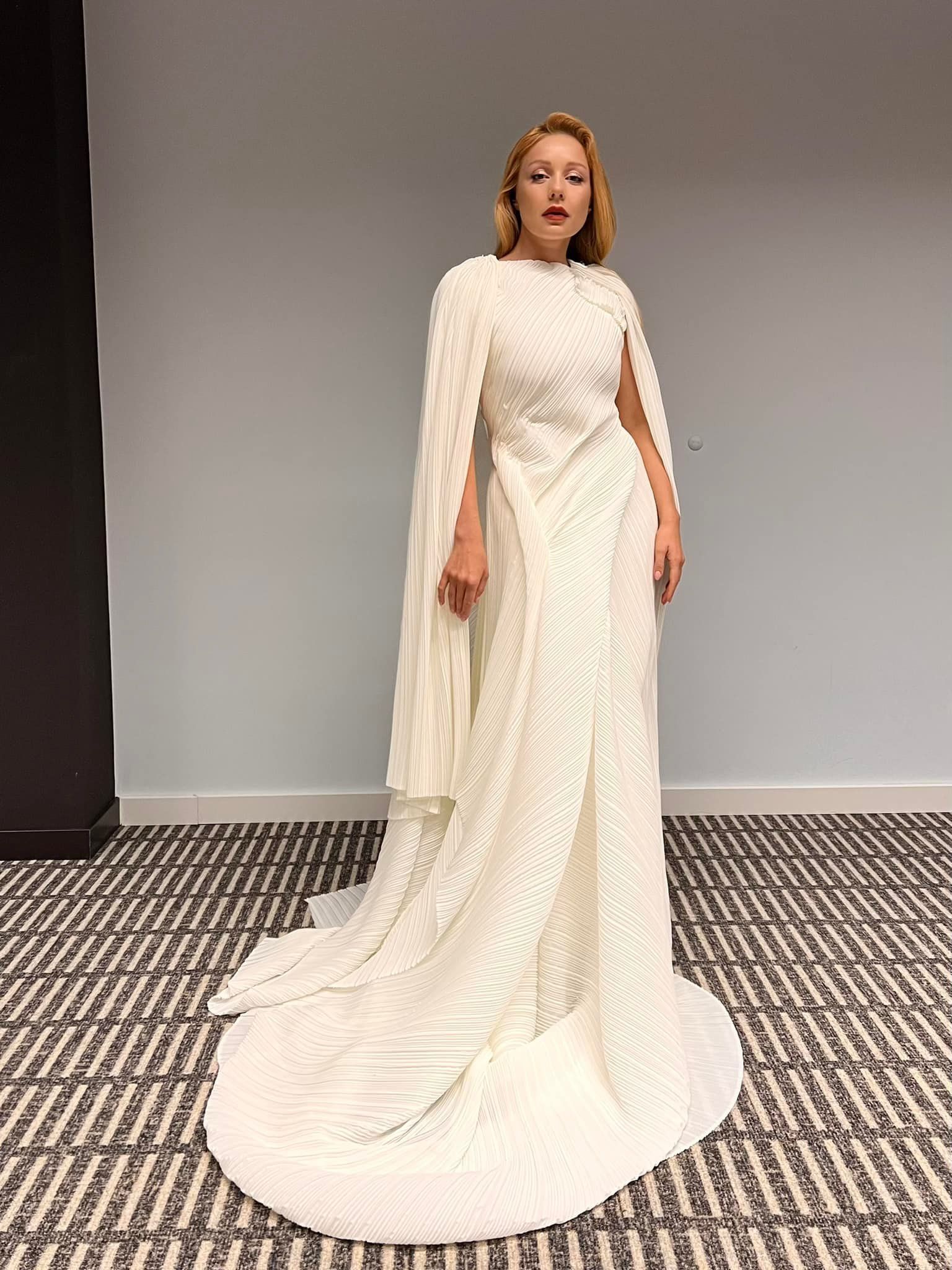 Біле вбрання складалося зі струмливої плісованої тканини, мало довгий шлейф і накидку. Образ Тіна доповнила елегантна зачіска та червона помада на губах.