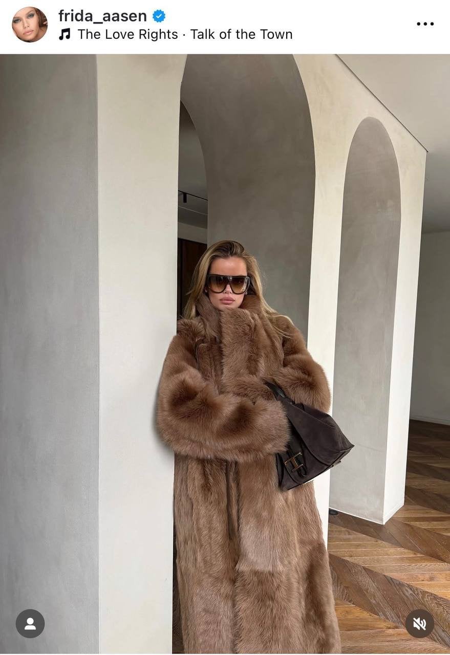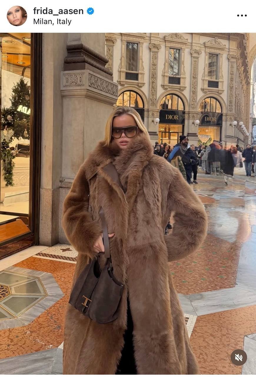Фріда позувала в довгій шубі — схоже, штучній, світлому лонгсліві та чорних шовкових штанах. Свій образ модель доповнила замшевою сумкою від Tod’s і коричневими сонцезахисними окулярами з градієнтом.