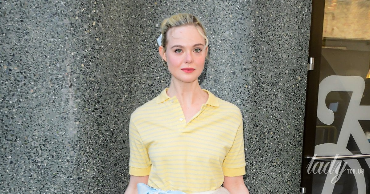 Побачивши фотографів, Ель зраділа, усміхнулася і почала їм позувати. Акторка мала милий вигляд у ніжному аутфіті. На зірці було жовте поло у смужку і світла повітряна багатошарова спідниця з блиском за коліна, яка на талії збоку була прикрашена двома бантами — блакитним і молочним із квіткою.
