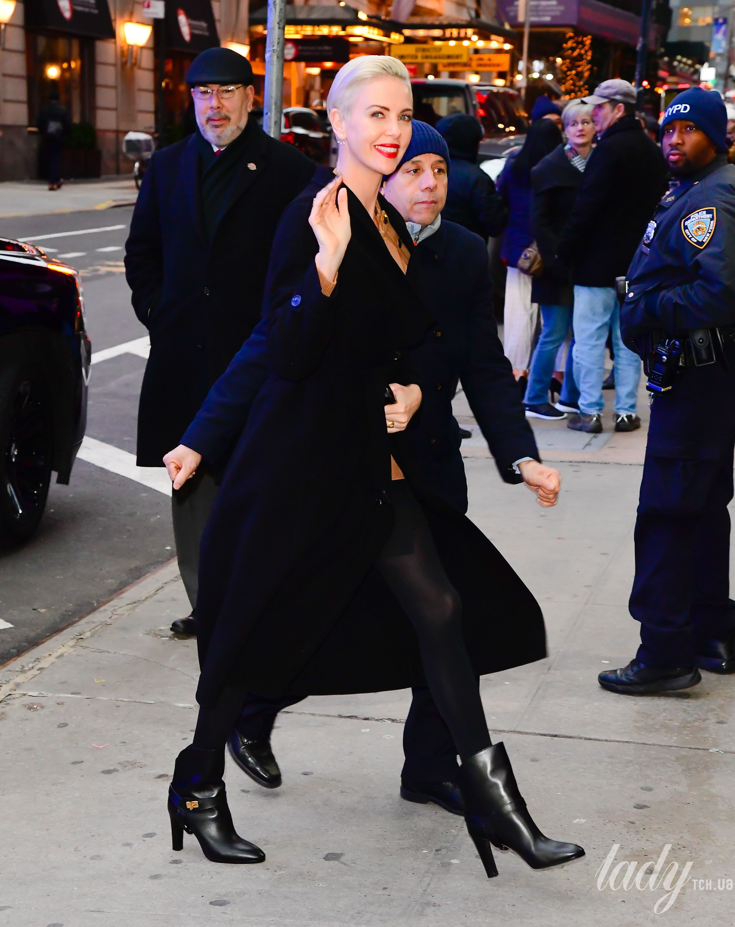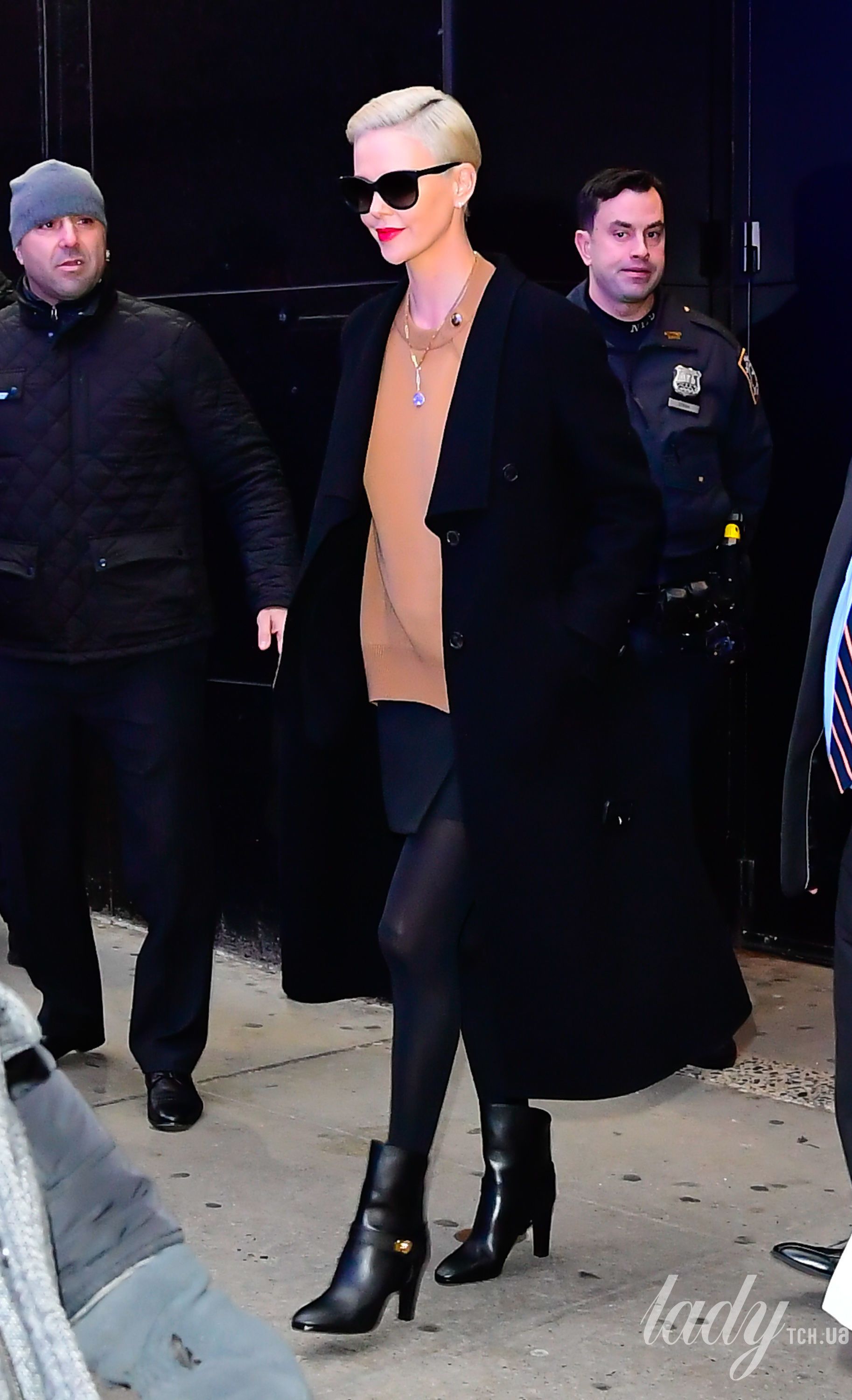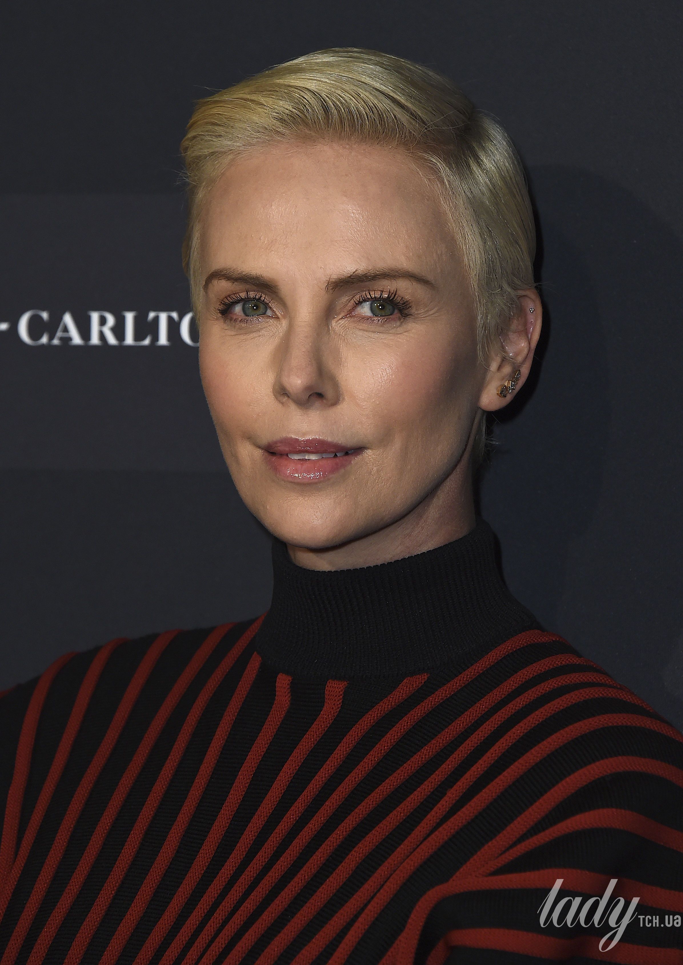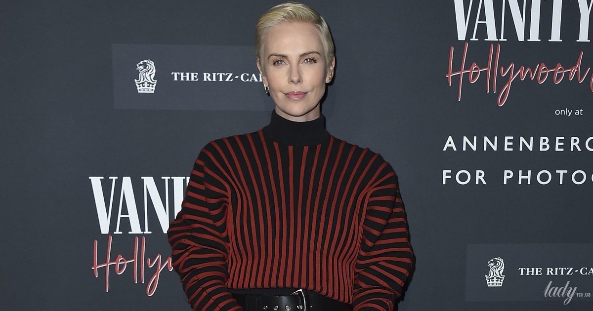 Вчора в Лос-Анджелесі відбулося відкриття фотовиставки журналу Vanity Fair, яку відвідала Шарліз Терон. Акторка обрала для свого виходу чорну сукню-светр у червону смужку, яку поєднала з чорними гостроносими ботильйонами. Талію зірка підкреслила чорним поясом і доповнила лук чорним клатчем.
