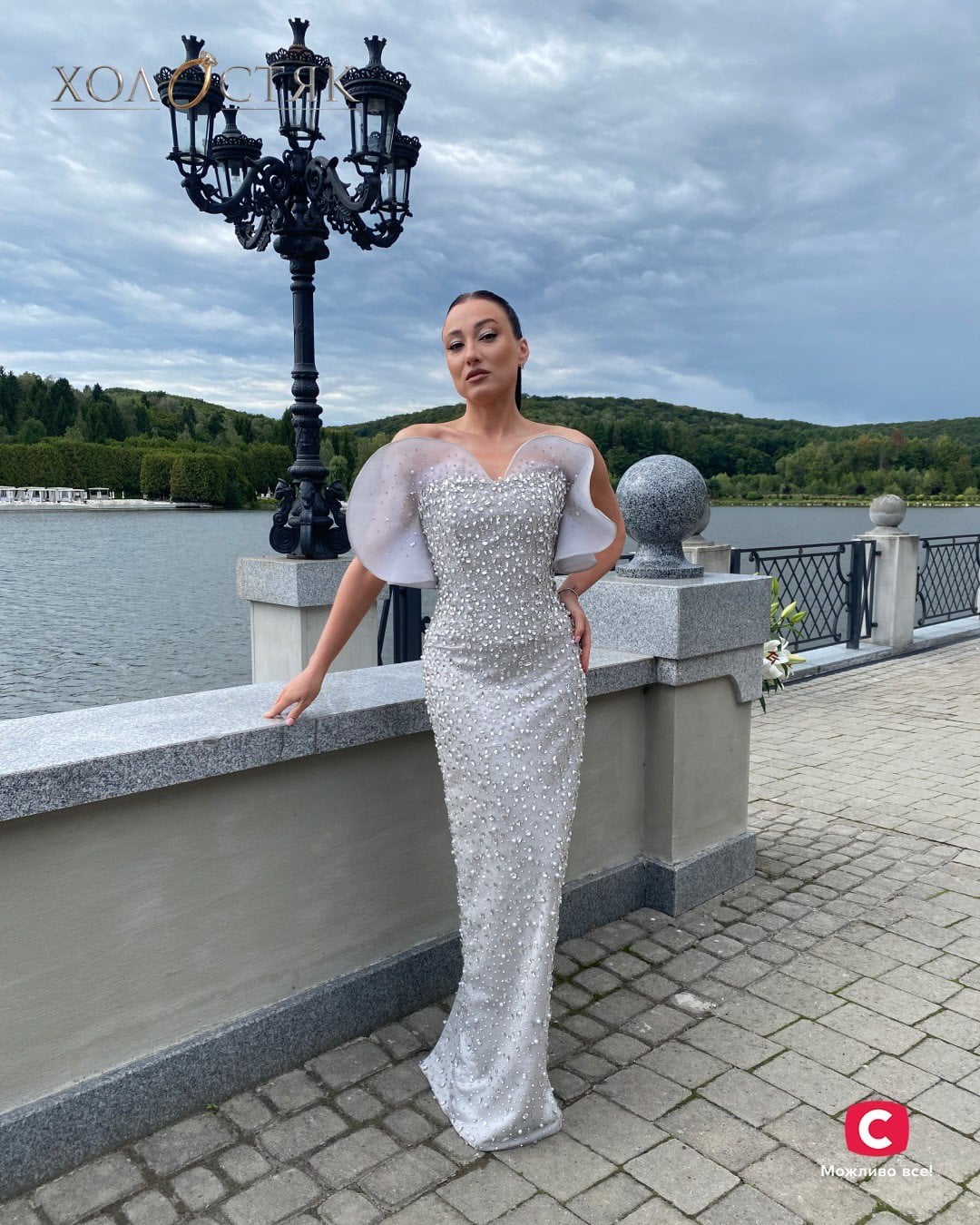 До Тараса Цимбалюка дівчина вийшла у світло-сірій сукні максі по фігурі і без бретельок. Вбрання було оздоблене камінням і напівпрозорими пелюстками. У ньому Настя мала стрункий і гарний вигляд.