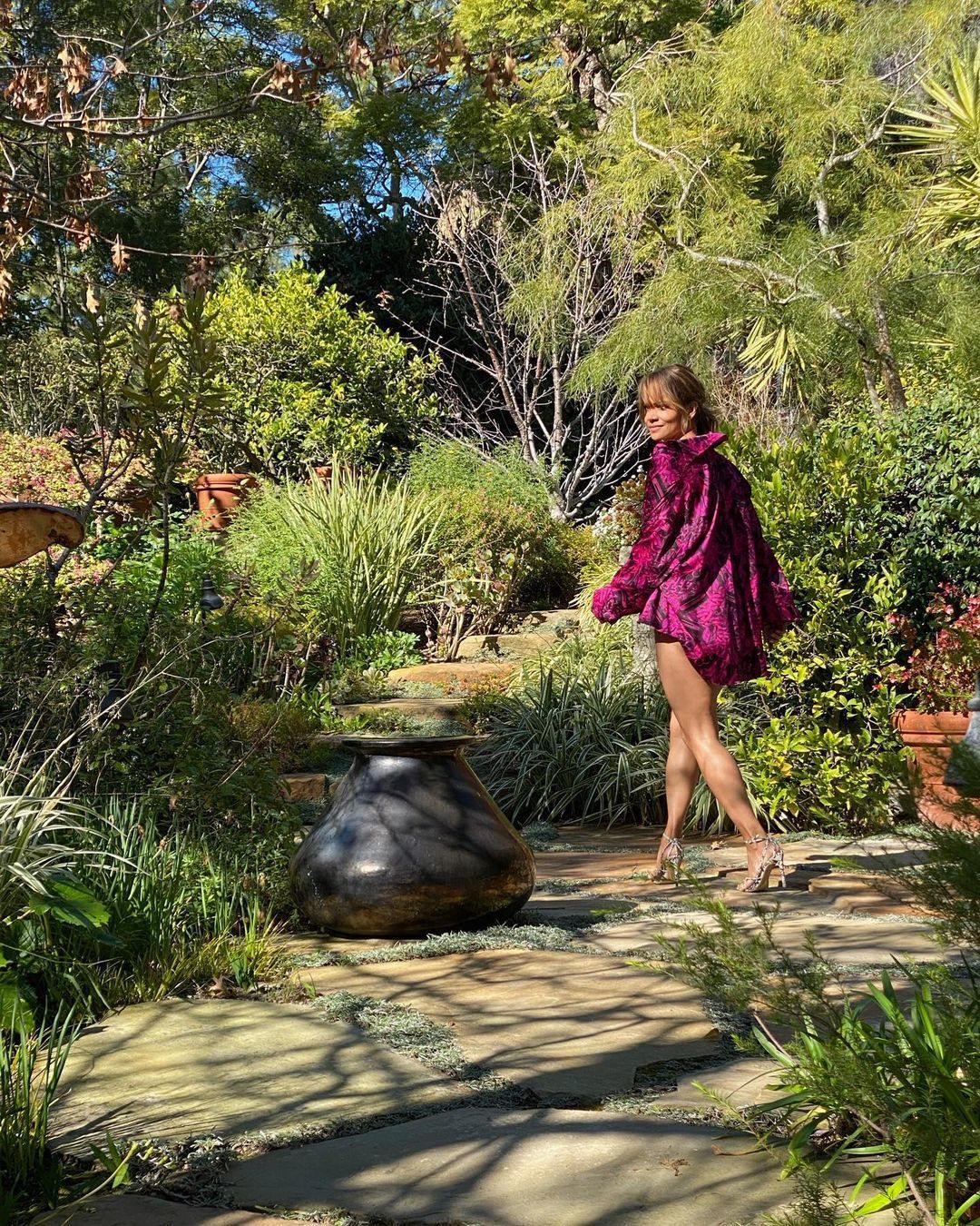На ньому зірка зазнімкована в саду спиною до камери. На акторці — коротке вільне вбрання кольору фуксії з принтом і босоніжки на шпильках.