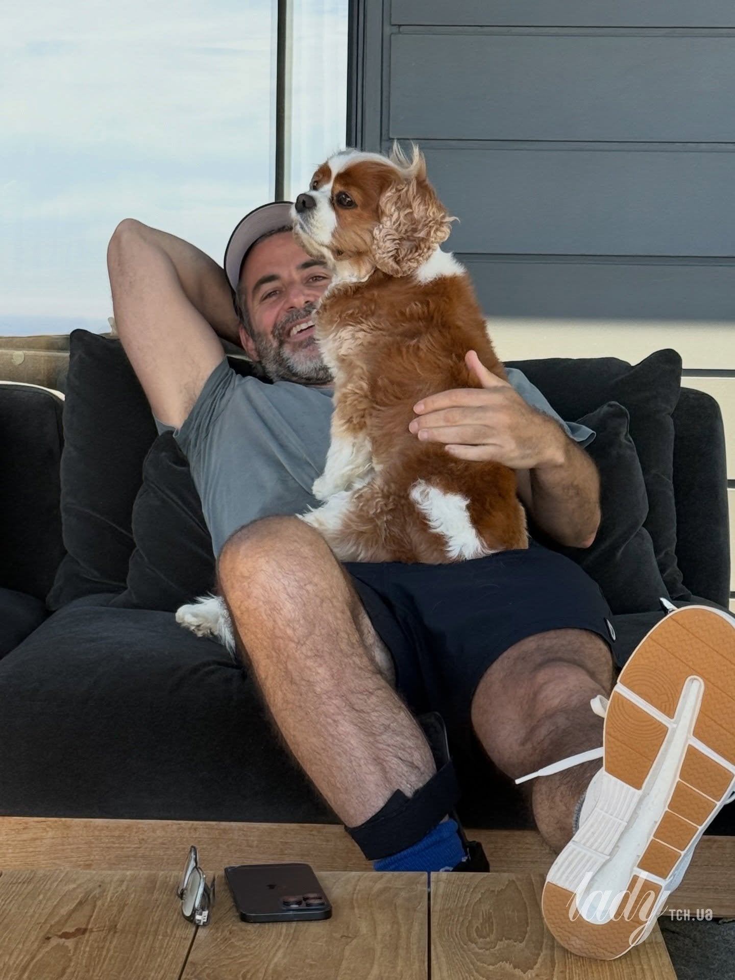 Також Кертіса сфотографували відпочиваючим на дивані зі своїм чарівним собакою на колінах, закинувши одну ногу на журнальний столик.