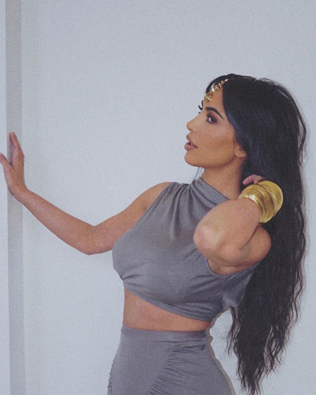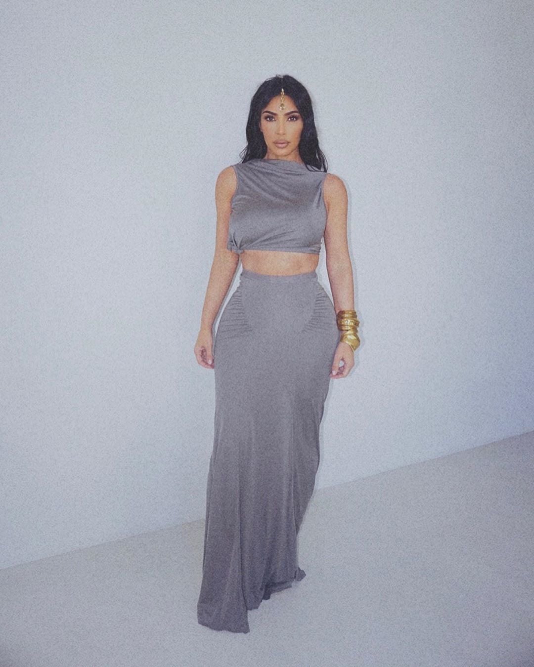 На нових знімках, якими поділилася зірка, вона зазнімкована у сірому трикотажному костюмі, який складається з кроптопа і максіспідниці. На одній руці у Кім величезна кількість золотих браслетів, а на лобі виблискує індійське прикраса. Кардашян нічого не написала в підписі до фотографій.