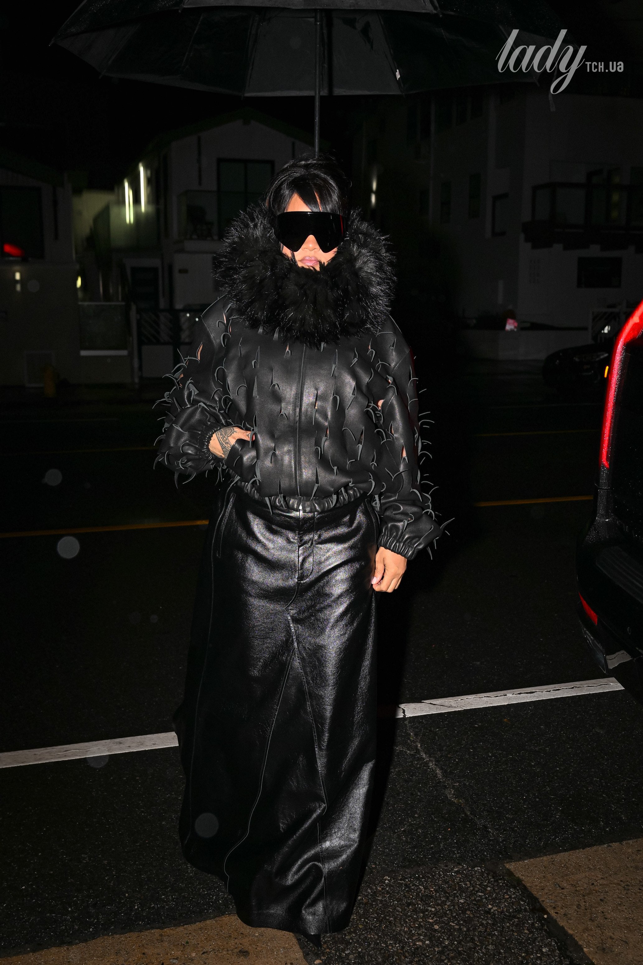 Верх співачка скомбінувала зі шкіряною спідницею максі та гостроносими чорними туфлями. На ній також були вже згадані стильні окуляри з дебютного показу П’єрпаоло Піччолі для Balenciaga, а в руці вона тримала лакований клатч Gucci з кінською струною, який не потрапив на фото. У Ріанни була зачіска з прикореневим об’ємом і блиск на губах.