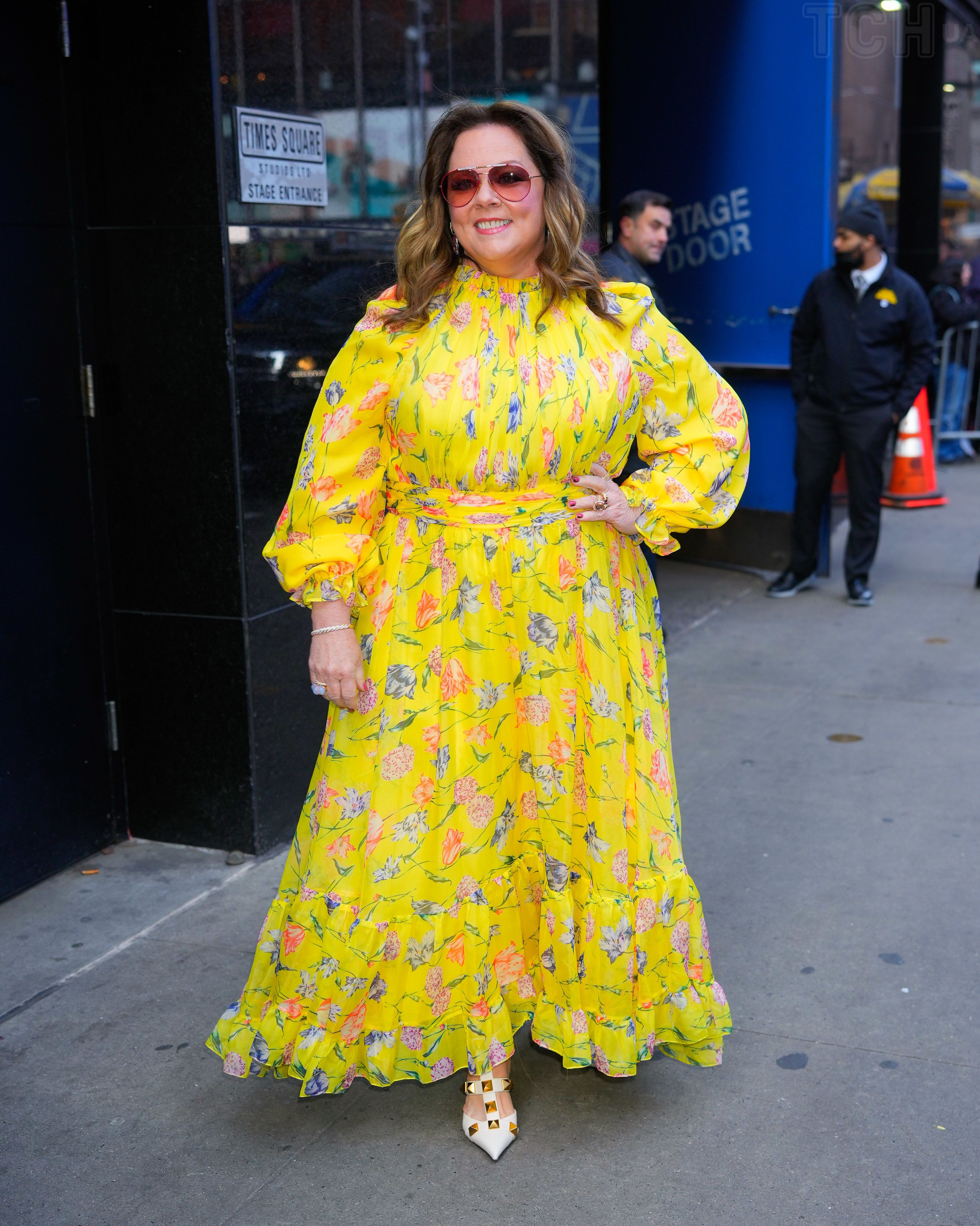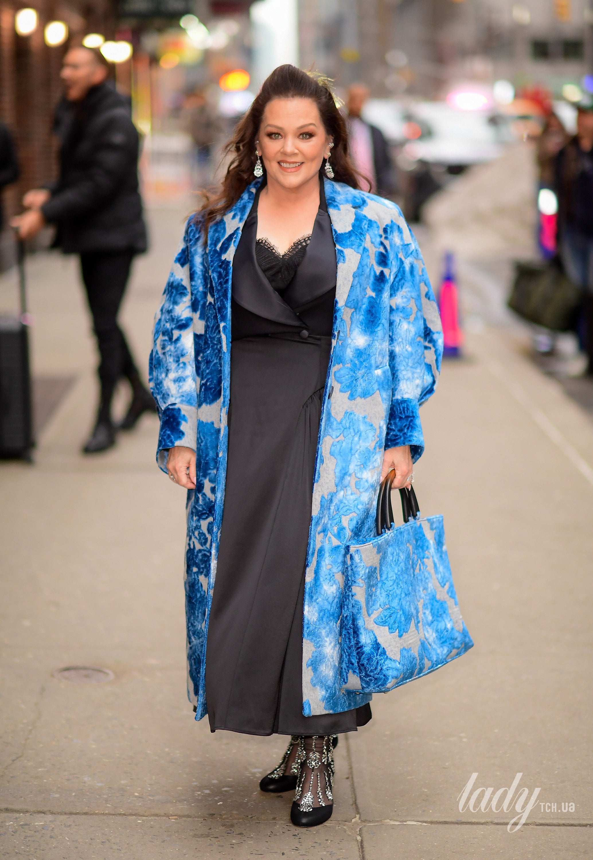 55-річна акторка Мелісса Маккарті була приголомшливою, коли її сфотографували папараці у Нью-Йорку. Зірка йшла на інтерв’ю на Late Show with Stephen Colbert у чорній сукні-жакеті з атласної тканини, яку прикрашав ґудзик і мереживо в зоні грудей.