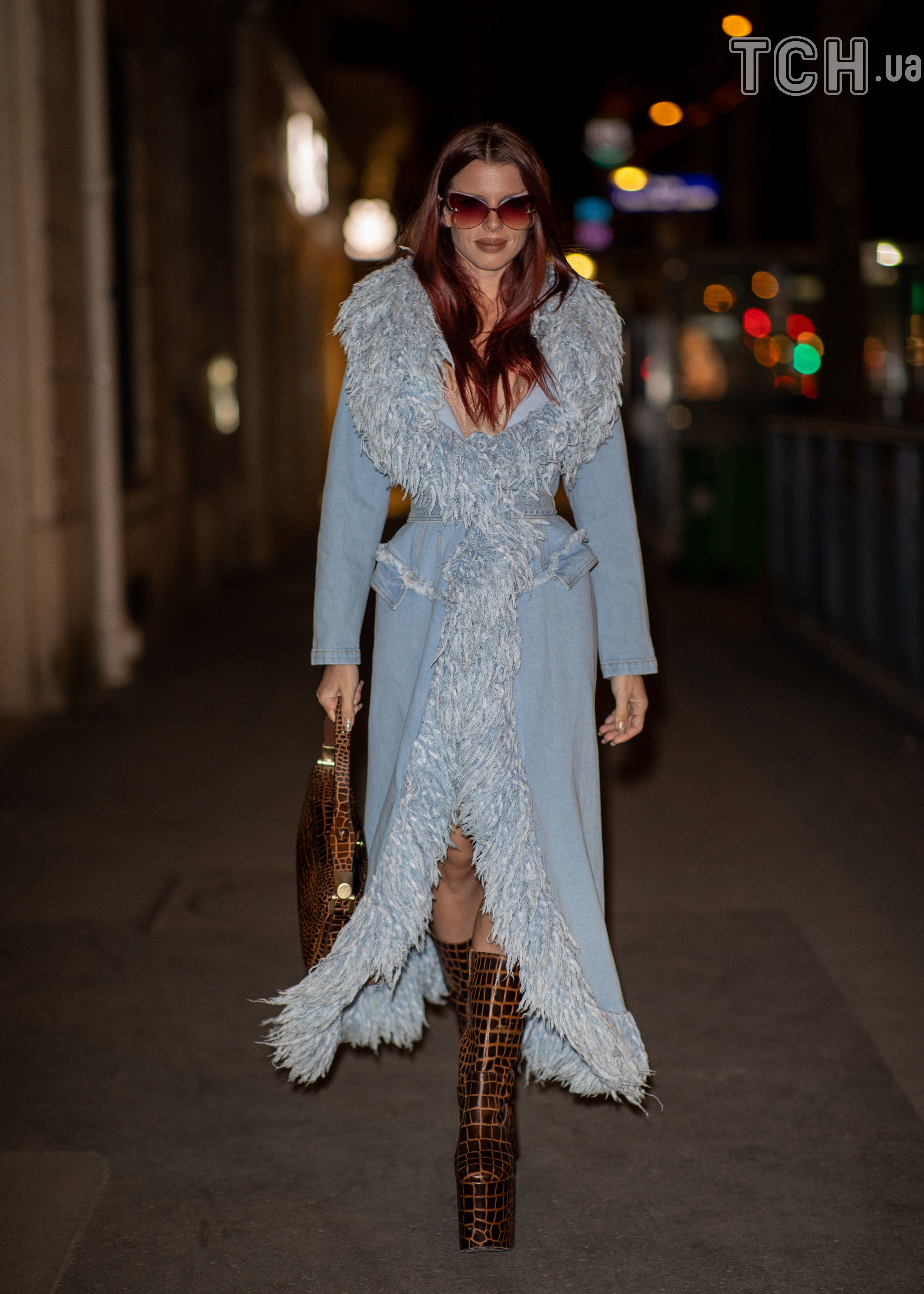 У руках вона тримала мінісумку від бренду Amina Muaddi, взула туфлі на величезній підошві та зробила червоний макіяж. На обличчі у моделі також була незвичайна прикраса, але потім вона її зняла.