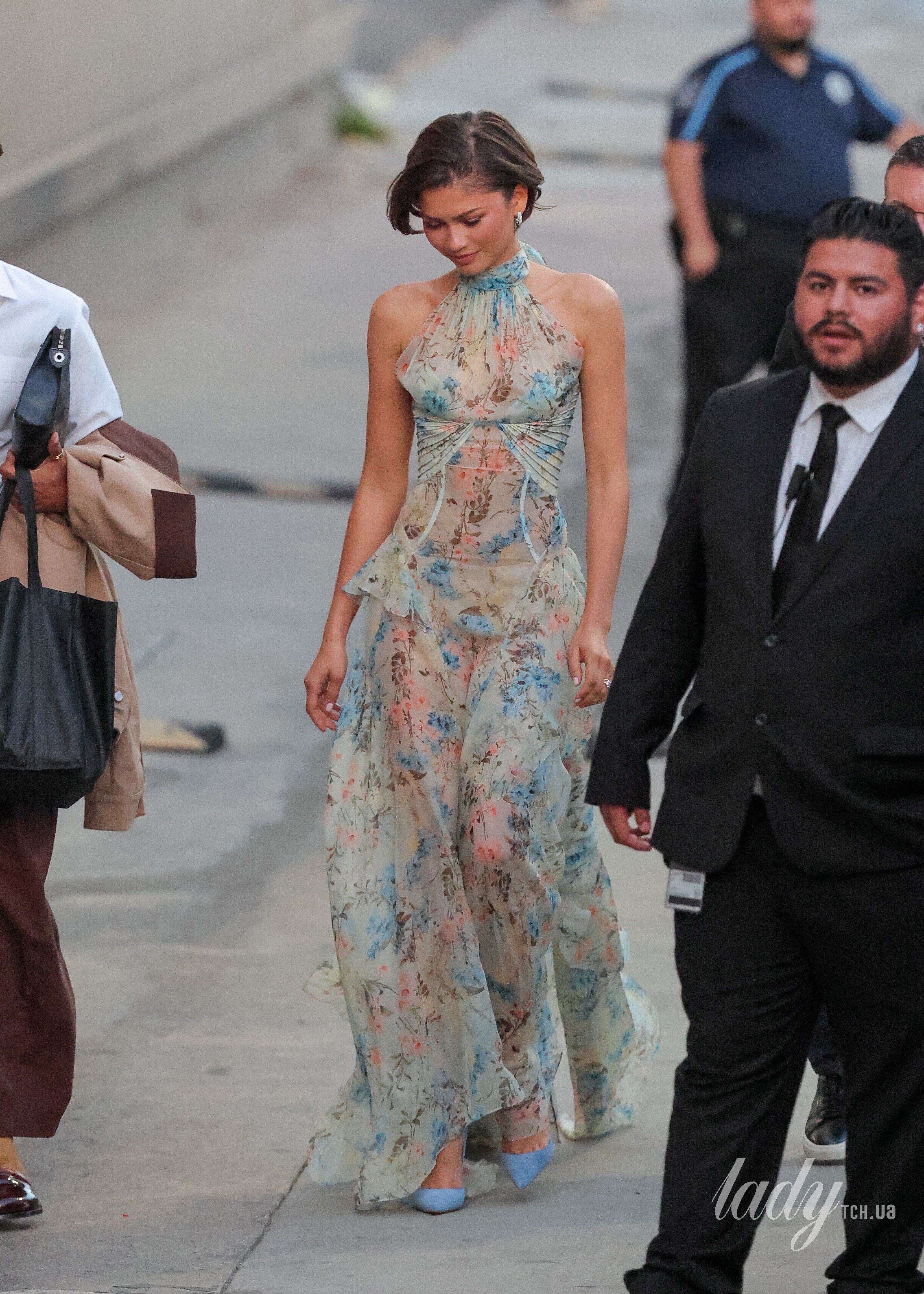 В ефірі Зендея з’явилася у дуже романтичній сукні від Alexander McQueen з колекції осінь-зима 2026. Це вишукане і легке вбрання було з напівпрозорого шифону у квітковий принт та з цікавими деталями, зокрема галтером, складками під грудьми, асиметричними шарами спідниці та асиметричним подолом.