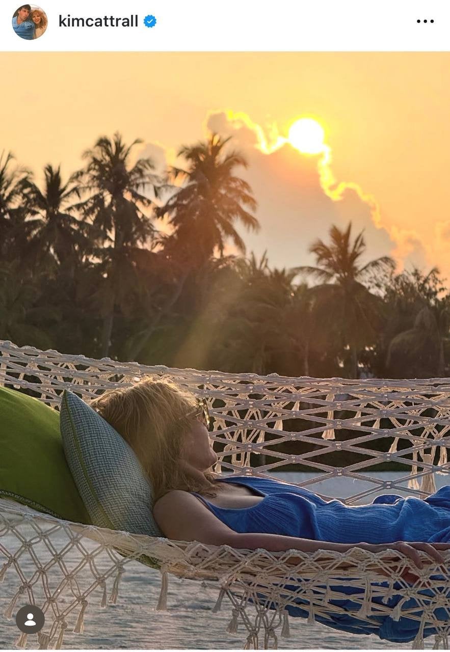 Судячи з фото акторки в Instagram, пара вирушила в медовий місяць на Мальдіви. Кім показала, як відпочивала на заході сонця в гамаку, дивилася на океан, а також селфі з Расселом.