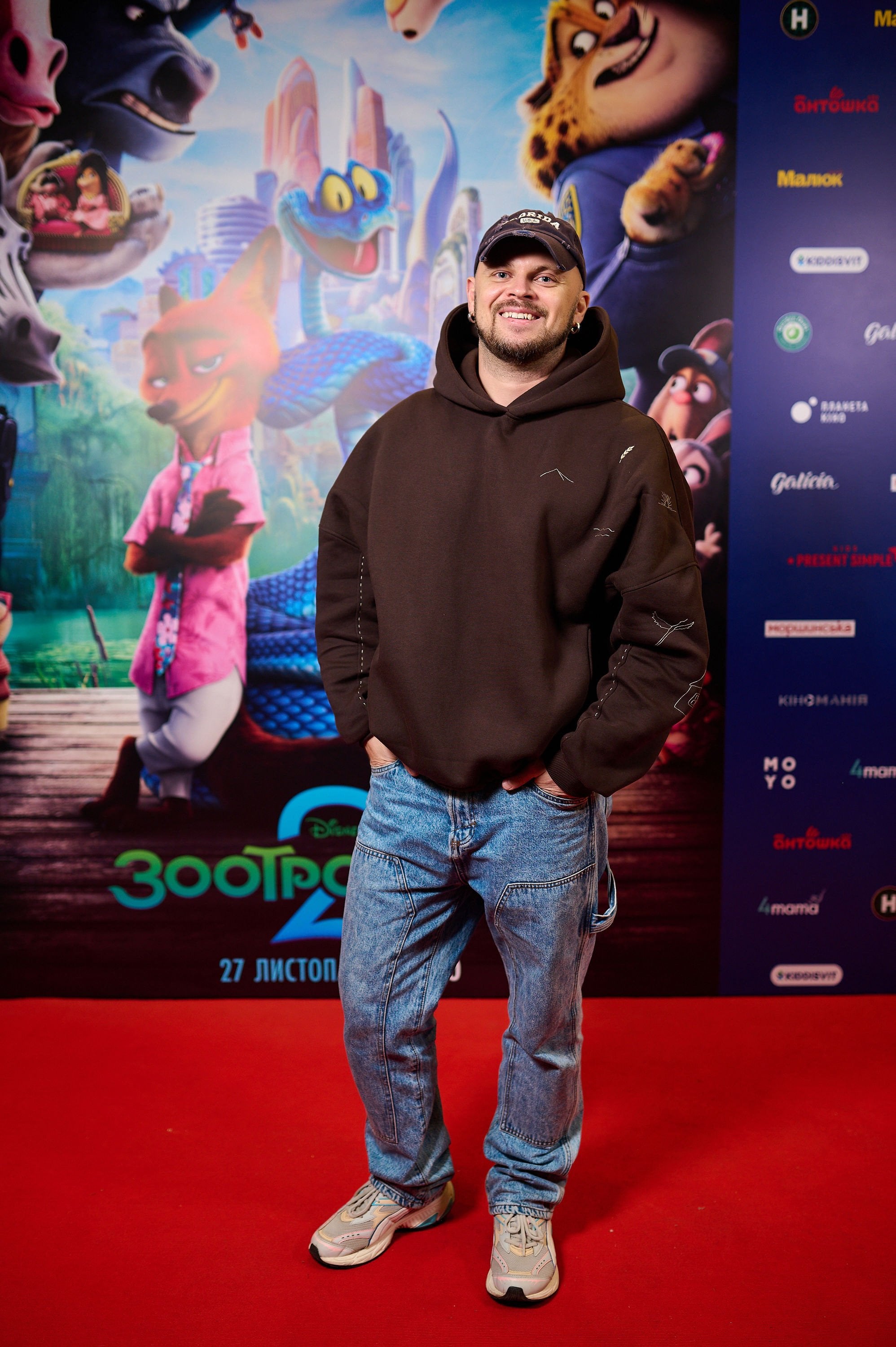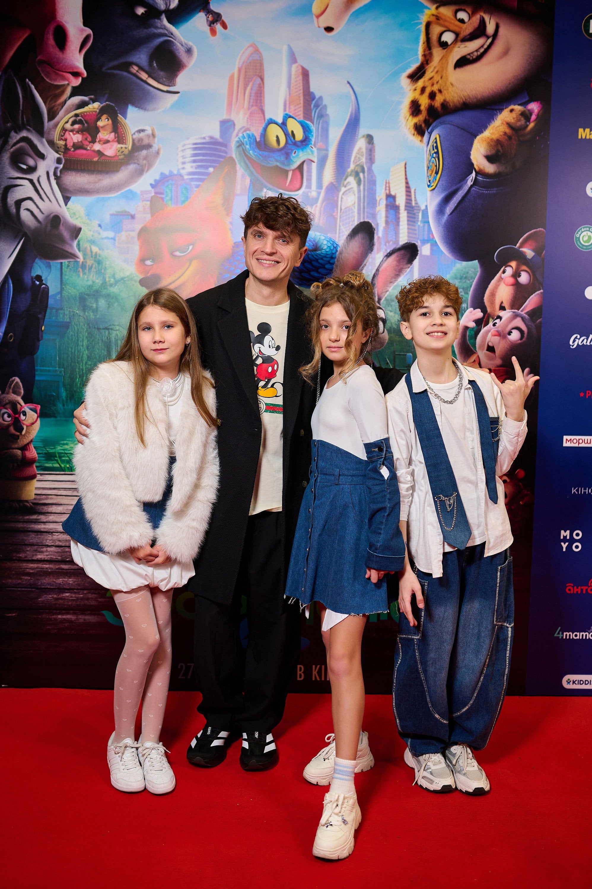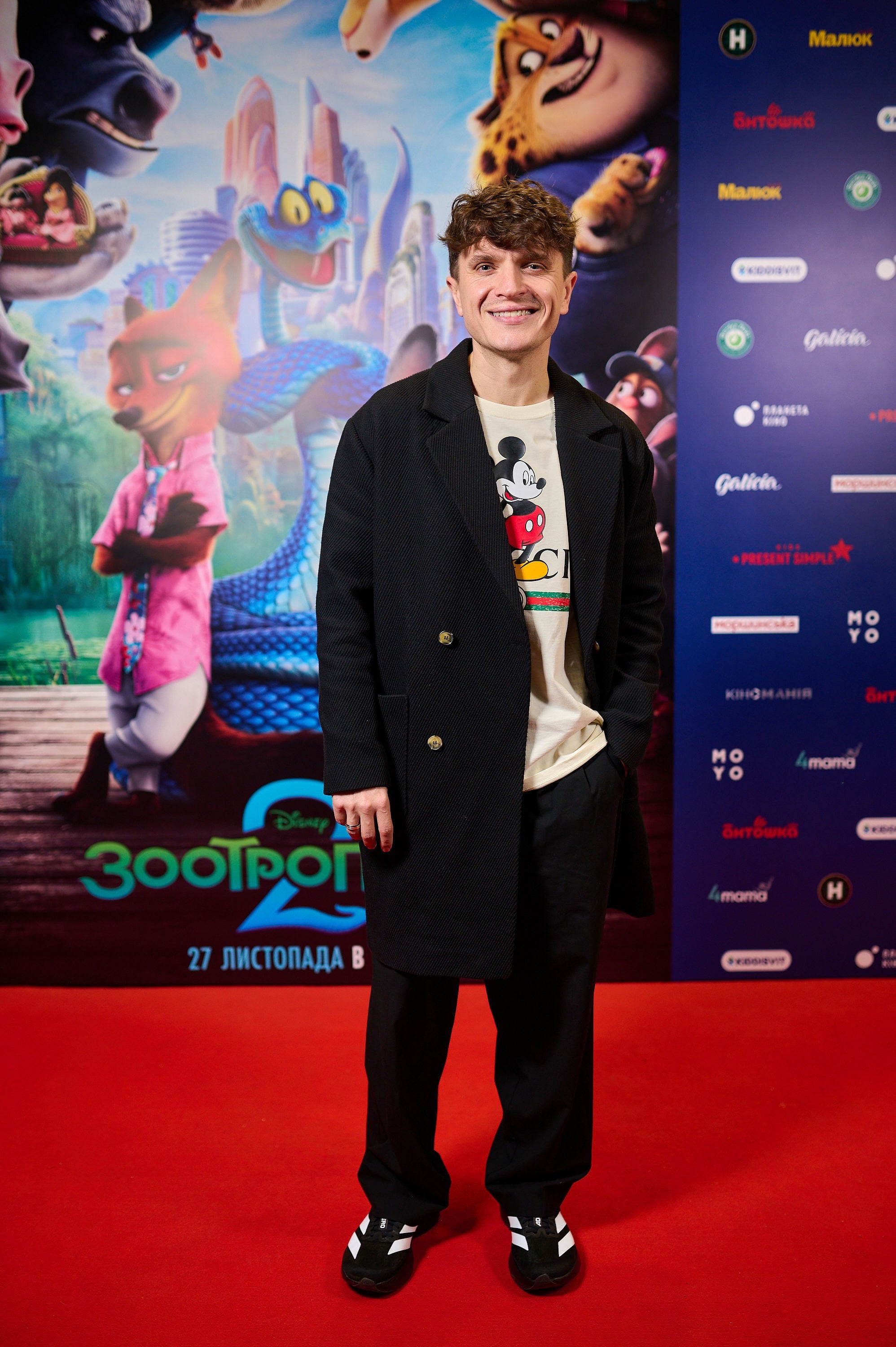 Зірки на прем’єрі мультфільму «Зоотрополіс 2»: Анатолій Анатоліч у футболці з Міккі Маусом, Олена Світлицька — у чорному лонгсліві