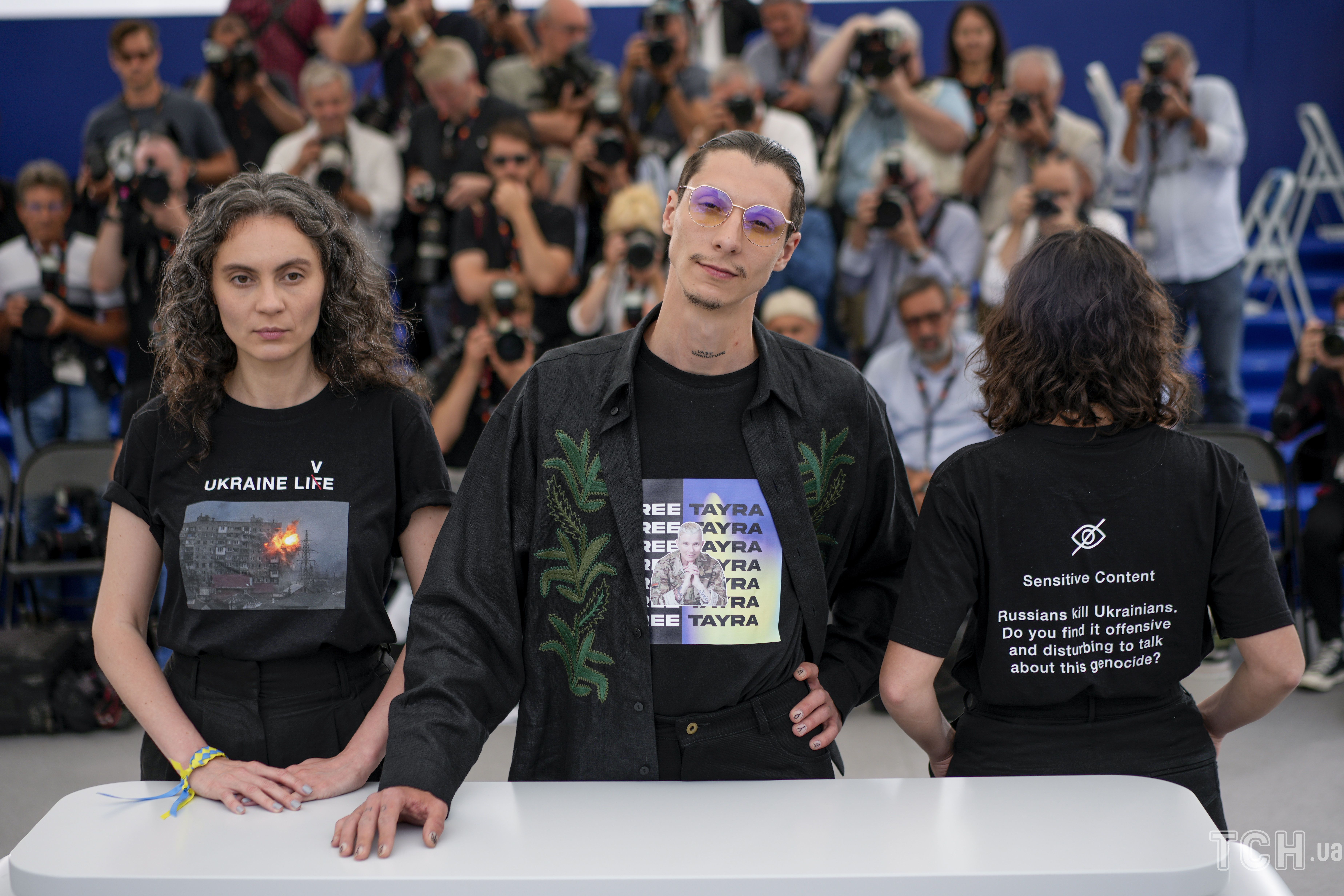 Сьогодні на фотоколі Максим Наконечний та продюсери фільму «Бачення метелика»: в якому як раз зіграли Рита Бурковська та Любомир Валівоць з'явилися у футболках із сильними гаслами та закликами звільнити парамедика Юлію Паєвську "Тайру".