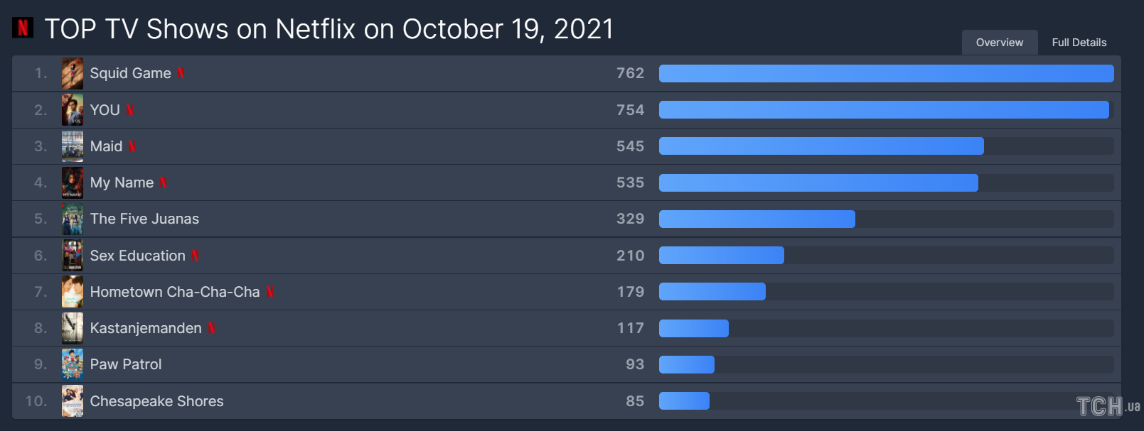 Але якби після свого виходу "Ти" не зайняв першу позицію, а "Гра в кальмара" протрималася на першому місці 29 днів, то змогла б побити рекорд серіалу "Джіні і Джорджія". Так корейський серіал протримався на першому місці 24 дні ставши найтривалышим періодом лідерства для неангломовних шоу на Netflix.