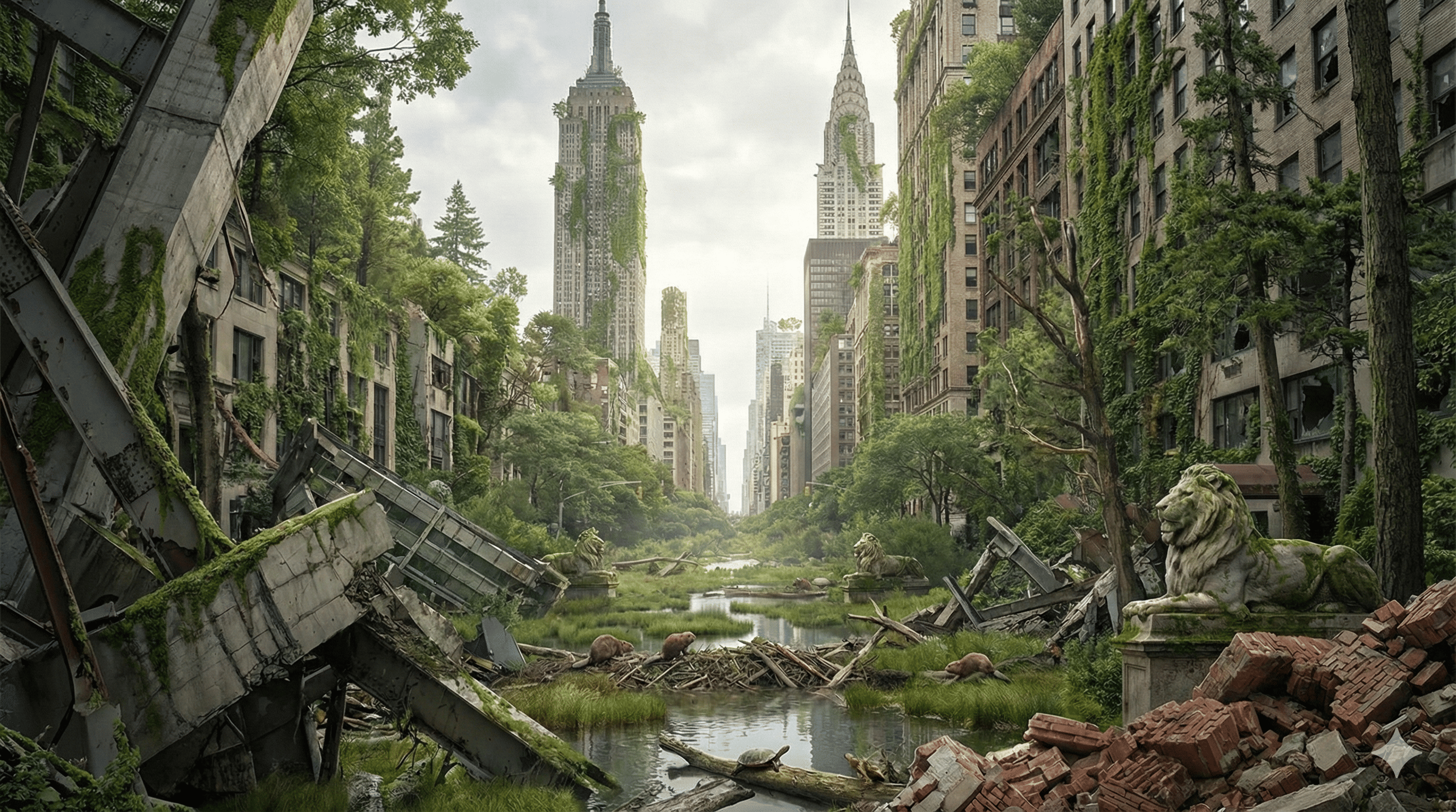 Зрештою, Нью-Йорк стане лісом з деревами заввишки 30 метрів. Бетон розчиниться, а парки перетворяться на болота з бобрами та черепахами. Але деякі сліди цивілізації, як-от мармурові леви біля Публічної бібліотеки або купи цегли, можуть зберегтися на тисячоліття як пам’ятник зниклому людству.