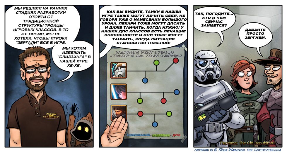 Реліз Star Wars відбувся ще в кінці 2011 року і гра вийшла досить сирою, про що свідчать вже більше 40 патчів і очікуване перше серйозне оновлення гри. Частина фанатів серії навіть припинила підписку після першого місяця поневірянь по безлічі планет і трьом PvP-зонам (Player vs. Player, - англ. бій гравця проти гравця). Так само велика частина гри просто скопійована з гранда ММО-індустрії - World of Warcraft. Мабуть, розробники вирішили піти простим шляхом - узяти все краще, що вже є.