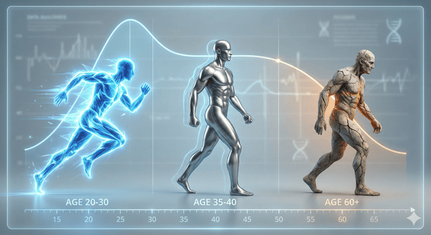 Після проходження піку організм починає втрачати потужність. Спочатку повільно (менш як 1% на рік), але після 45 років процес пришвидшується вдвічі.