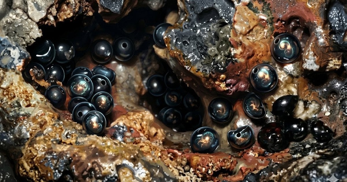 Об’єкти були вперше помічені під час занурення дистанційно керованого апарату в абісальній зоні — регіоні, який характеризується екстремальним тиском та повною темрявою. Сфери були вугільно-чорними та міцно прикріпленими до скелі, що різко виділялося на тлі бідного глибоководного середовища.