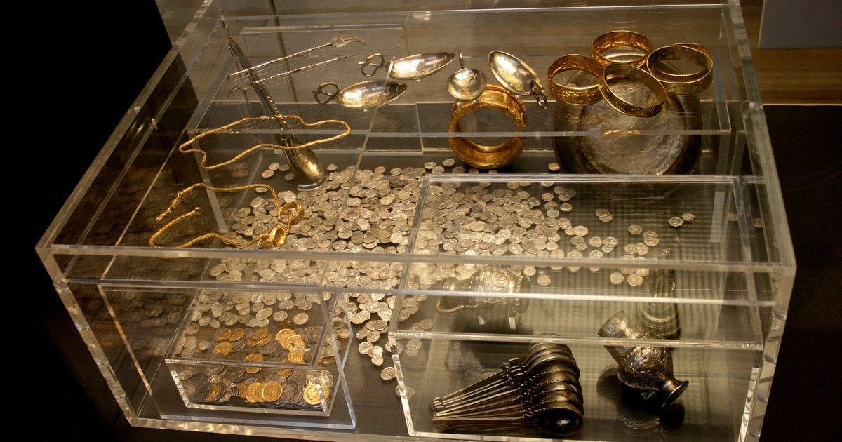До складу скарбу увійшли 15 233 монети, срібний посуд, золоті прикраси, десятки ложок і навіть туалетне приладдя. Археологи також виявили залишки дубової скрині з внутрішніми перегородками, у якій цінності були акуратно складені й загорнуті в тканину та солому. За датуванням монет встановлено, що скарб заховали після 407–408 років нашої ери, хоча частина грошей перебувала в обігу ще кілька десятиліть до того.