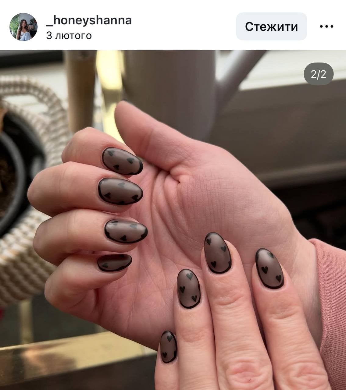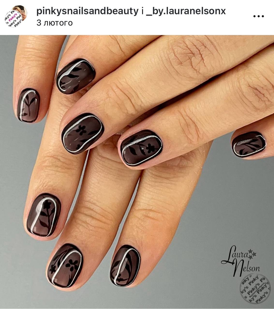 «Вигляд прозорих чорних нігтів — це ідеальне поєднання зухвалості та невимушеності. Він бере щось таке сміливе, як чорний, і пом’якшує його напівпрозорим покриттям. Це щось на кшталт димчастої вуалі для ваших нігтів», — розповідає майстерка манікюру Андреа Барбе.