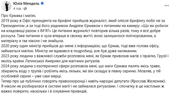 Мендель розповіла, що 2020 року один міністр прийшов до неї з інформацією, що Єрмак займається магією. Міністр не вдавався в подробиці, але був дуже наляканим.