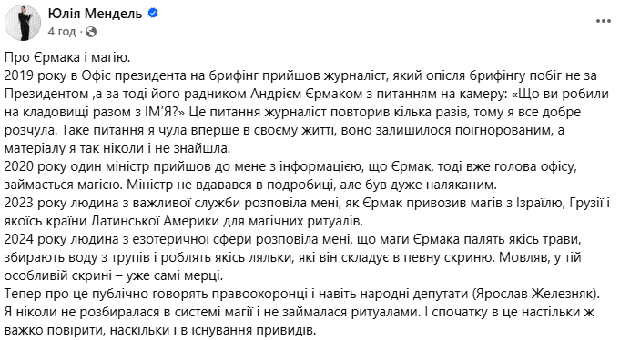 «2024 року людина з езотеричної сфери розповіла мені, що маги Єрмака палять якісь трави, збирають воду з трупів і роблять якісь ляльки, які він складує в певну скриню. Мовляв, у тій особливій скрині — уже самі мерці. Тепер про це публічно говорять правоохоронці і навіть народні депутати (Ярослав Железняк)», — зазначила Мендель.