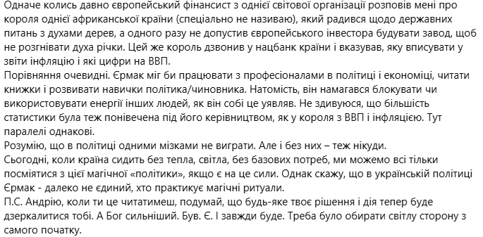 Крім того, Мендель стверджує, що в українській політиці Єрмак — «далеко не єдиний, хто практикує магічні ритуали».
